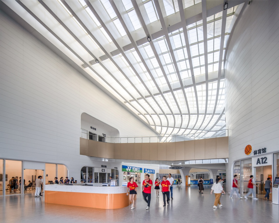 主馆、小球馆、训练馆、运动员酒店等五大功能体量由一条“中庭HUB”串联贯通;中庭两侧嵌入餐饮、零售等服务业态,形成如shopping mall般的开放主街,不仅串联南北主力功能,也激活了与周边商业的互动。
