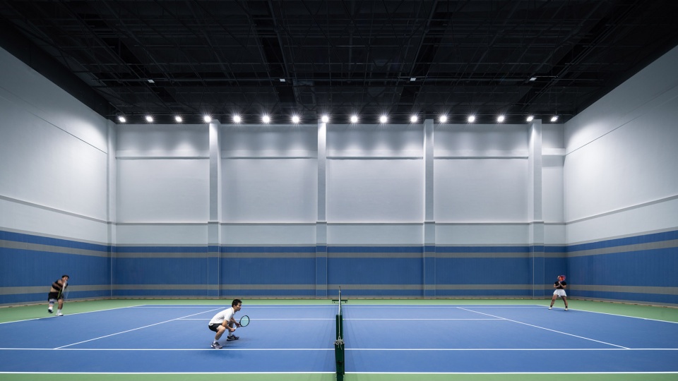 训练馆:建筑面积约7900m²,净高13.5米,设置有24片羽毛球训练场和2片网球场(1片固定,1片可通过羽毛球场转换);地下一层配备25m四泳道泳池及健身房。