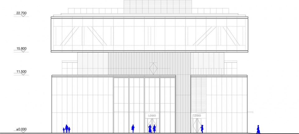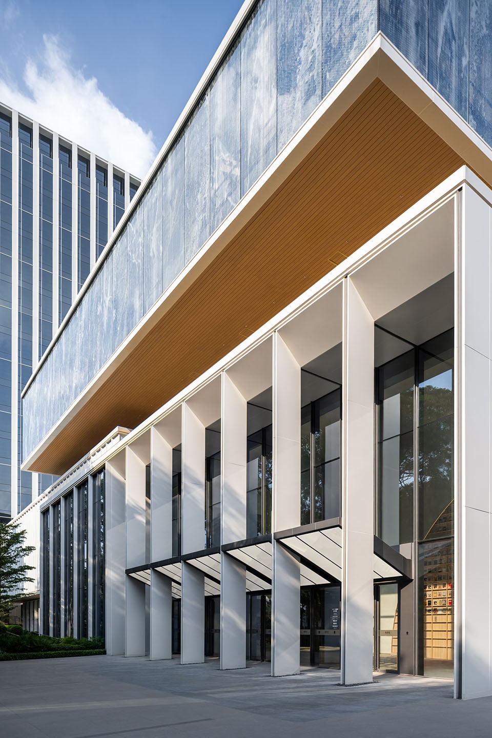 The façade design translates this diversity into a coherent whole: vertical frames, articulated horizontal slabs, and translucent glass respond to the interior programs, balancing openness and privacy. The transparent ground floor invites the public in; the floating middle volume, wrapped in frosted glass, accommodates community spaces; and the upper volume, defined by fritted glass panels, houses the theater and public lobby. Warm wooden finishes on terraces and soffit bring a tactile, human quality to the structure.