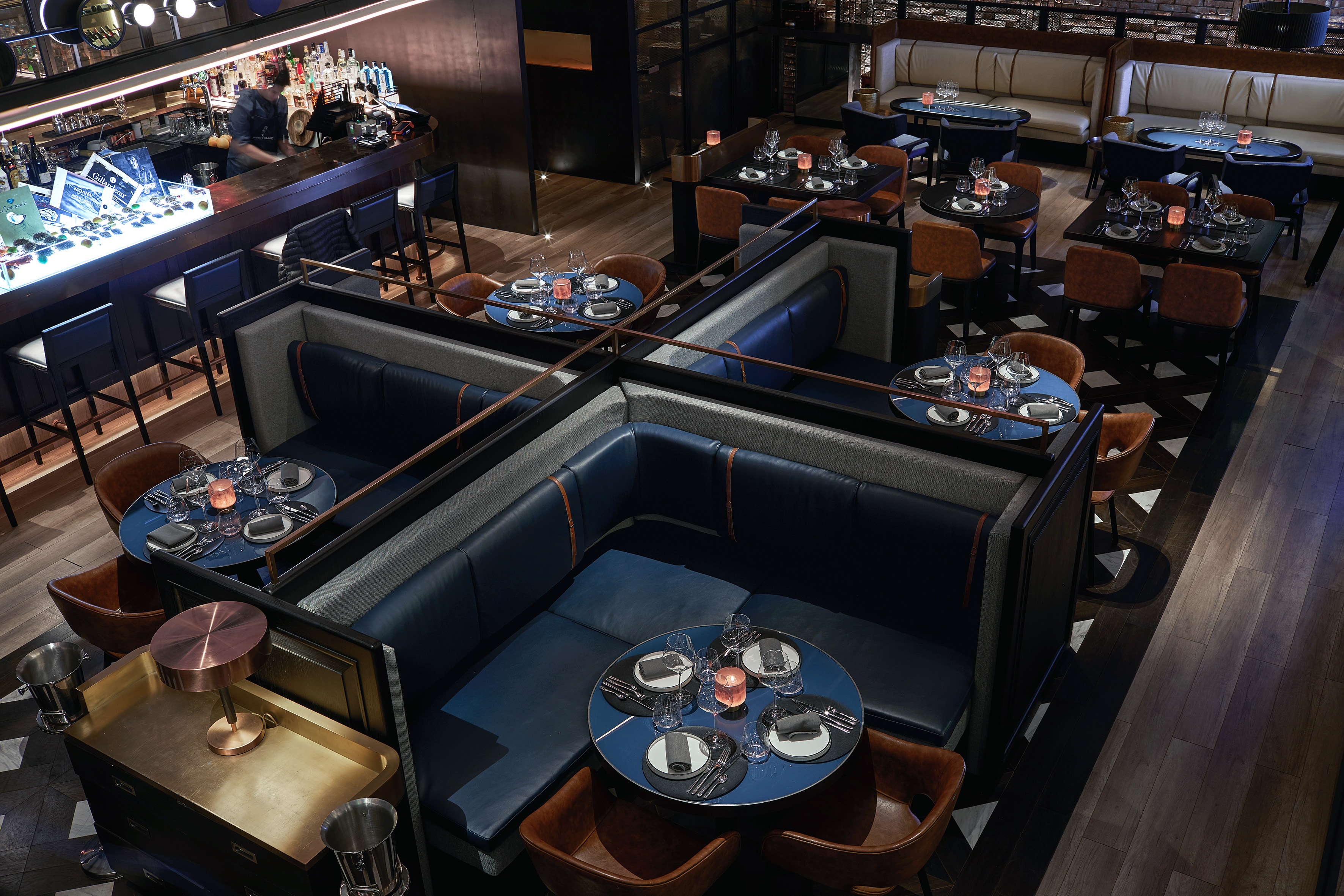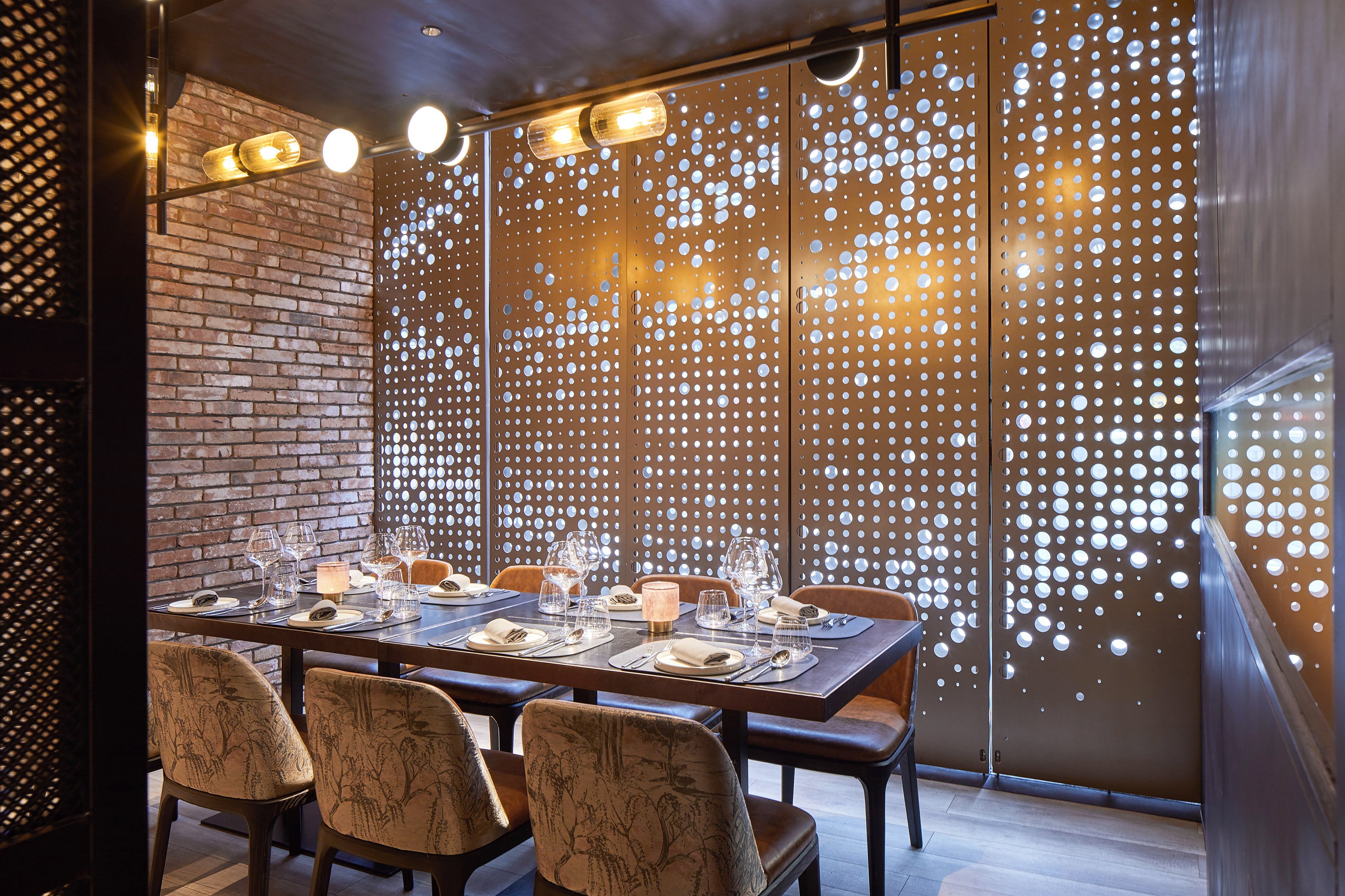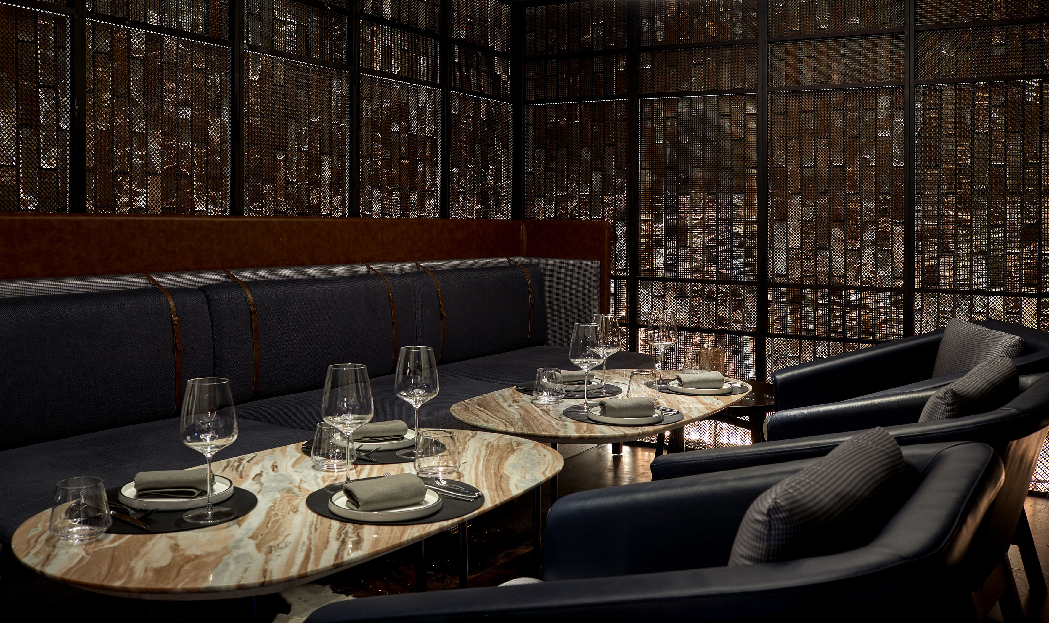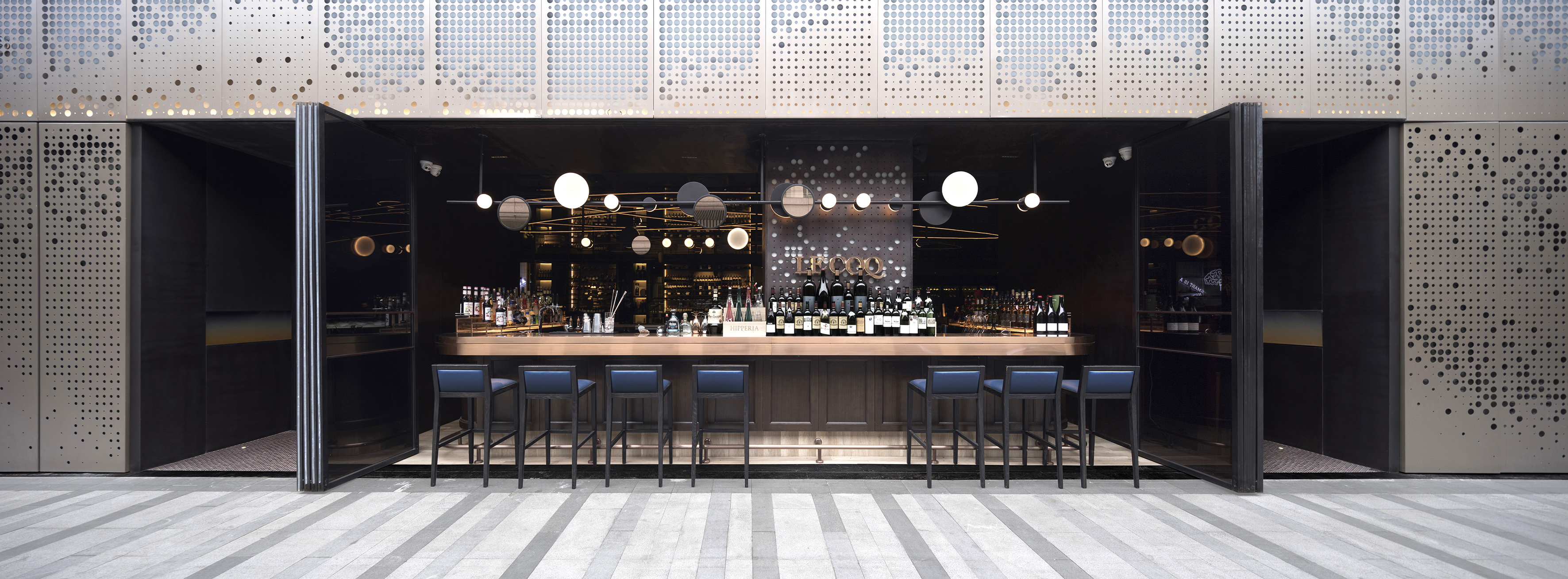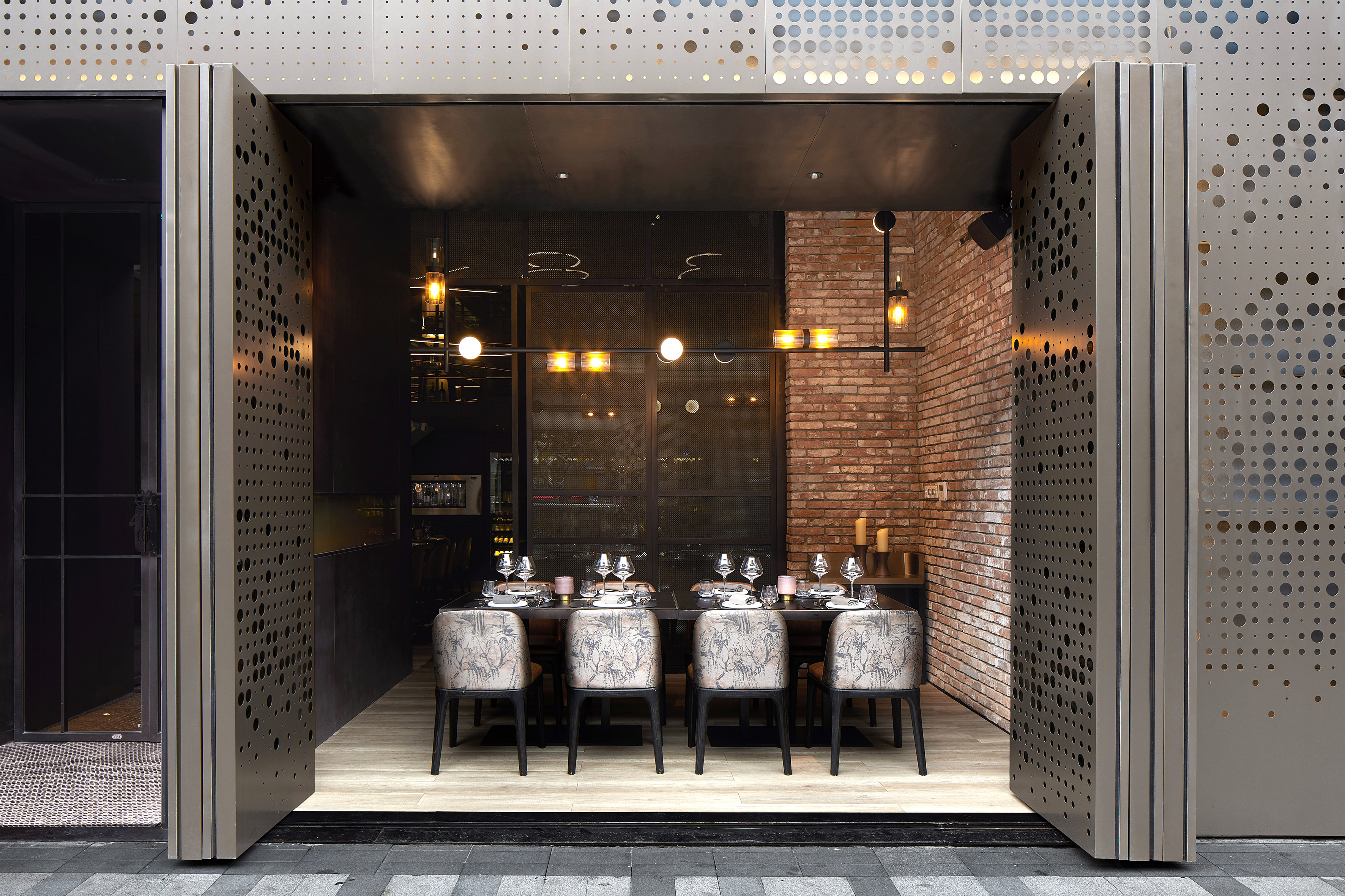 Once the façade is closed, the staff can close the second layer of doors and create VIP rooms. the light coming through holes offers privacy, but also a nice vibrating lighting play through different hole sizes. the atmosphere has been targeted to feel sophisticated and very warm with a playful balance in color, between the blue and the orange in furniture.