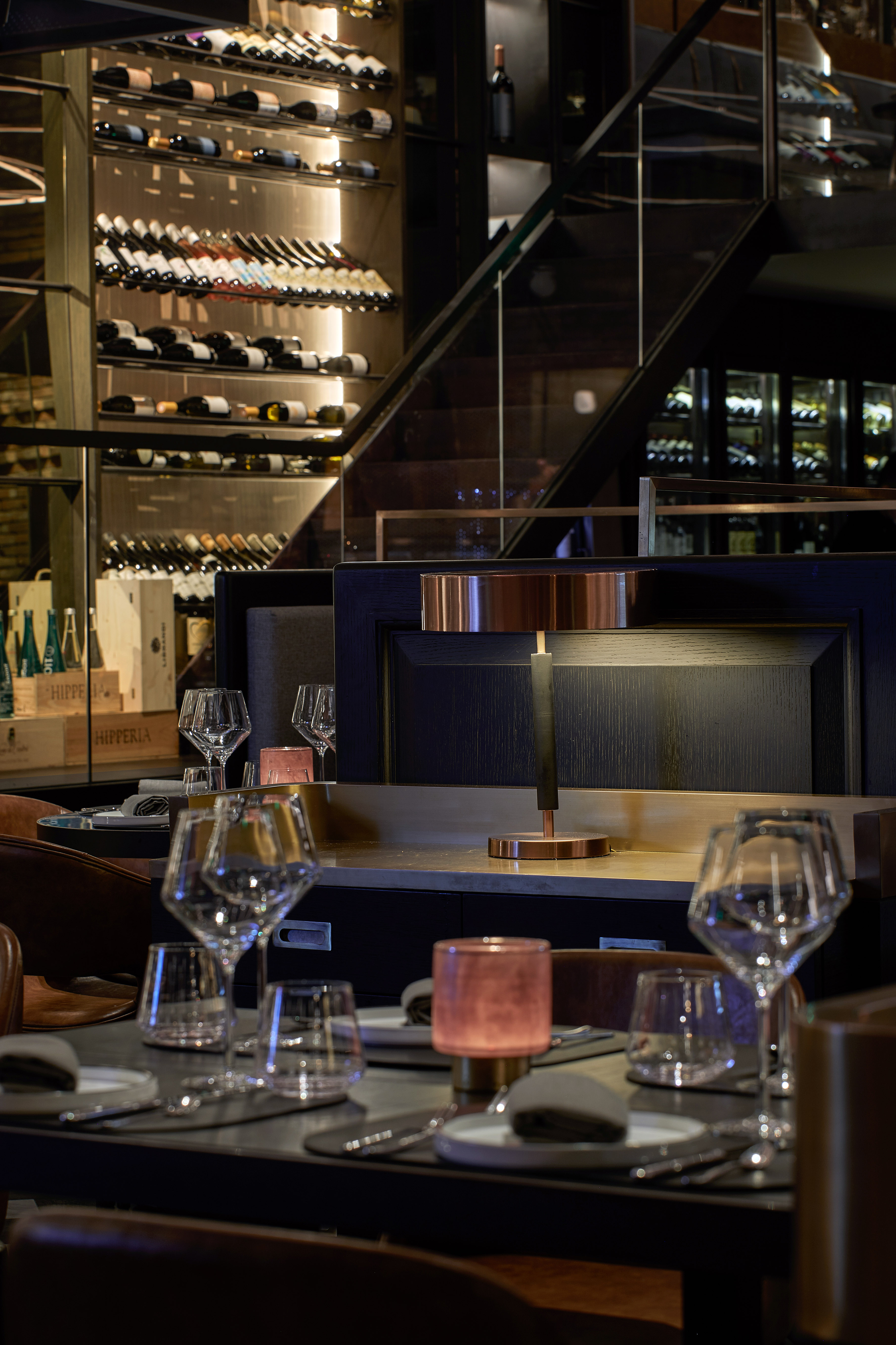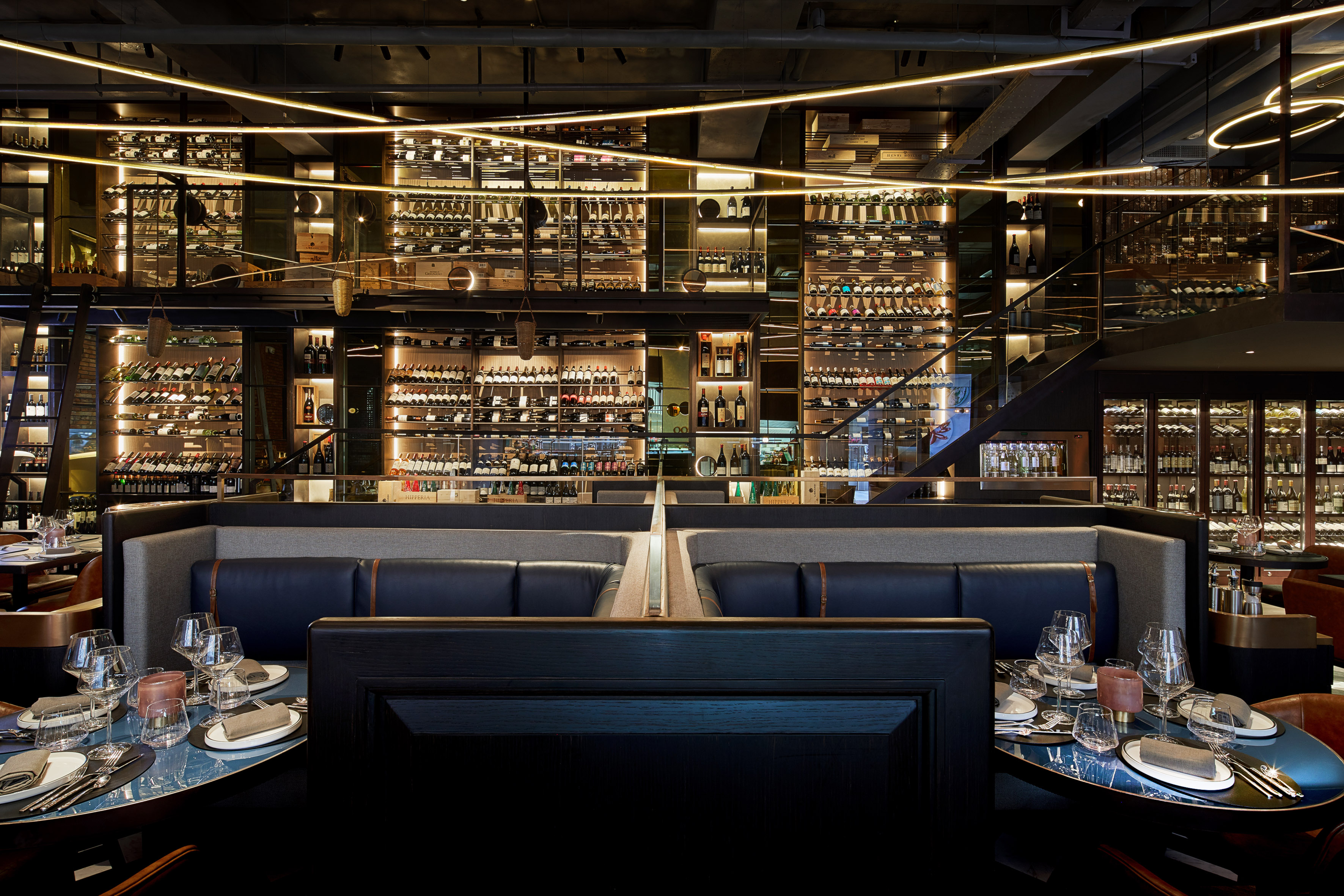 用餐区位于葡萄酒图书馆和酒吧之间的空间中间。当调酒师在吧台端上酒杯时,可以观察服务员,爬梯子进入更高的平台选择一瓶酒。一旦被选中,这瓶葡萄酒就会使用绳索系统装在一个篮子里。为客户带来全方位的葡萄酒体验。