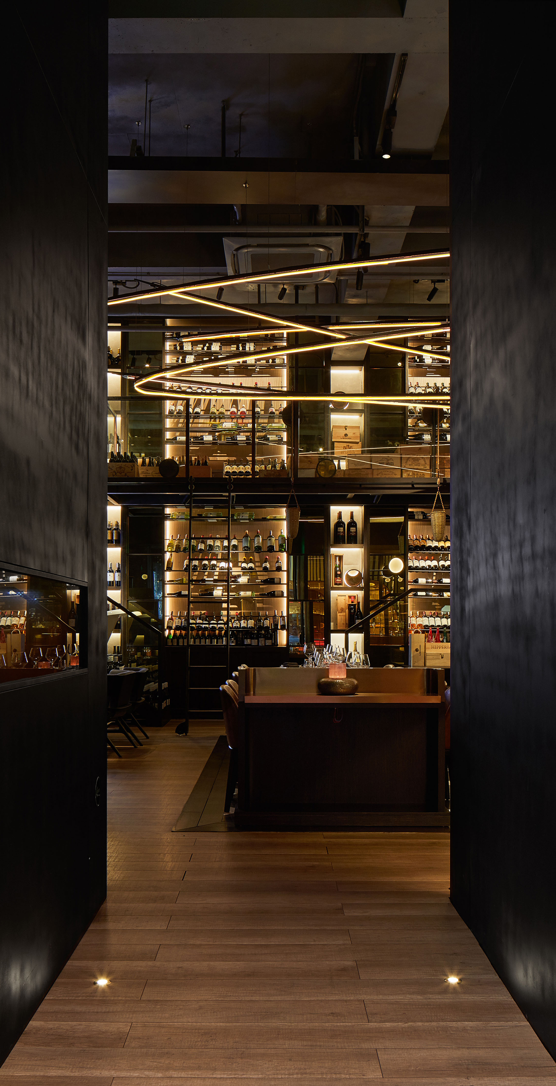 The dining area is located in the middle of the space between the wine library and the bar. while the bartender serves wine glasses at the bar, one can observe waiters, climbing ladders to access higher platform to select a bottle of wine. once chosen, the bottle of wine is delivered in a basket using a rope system. It brings full scenery os wine experience to the customer.