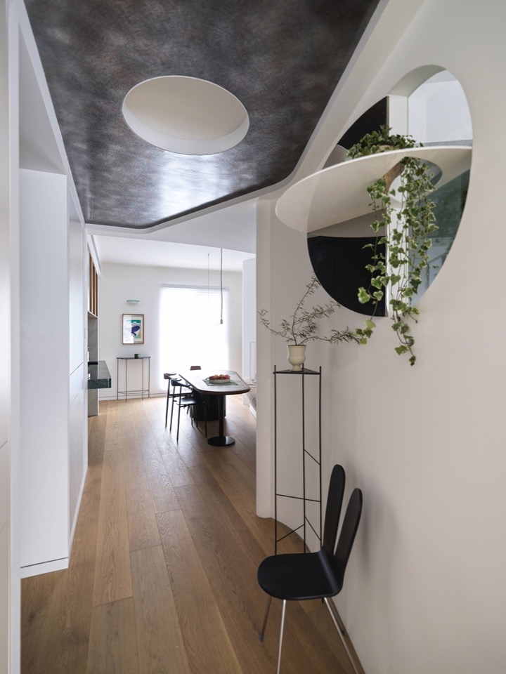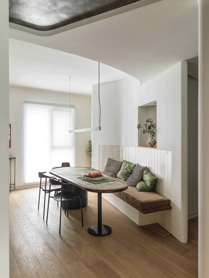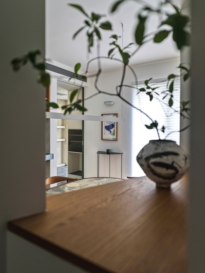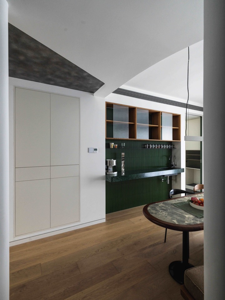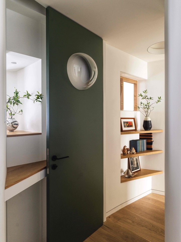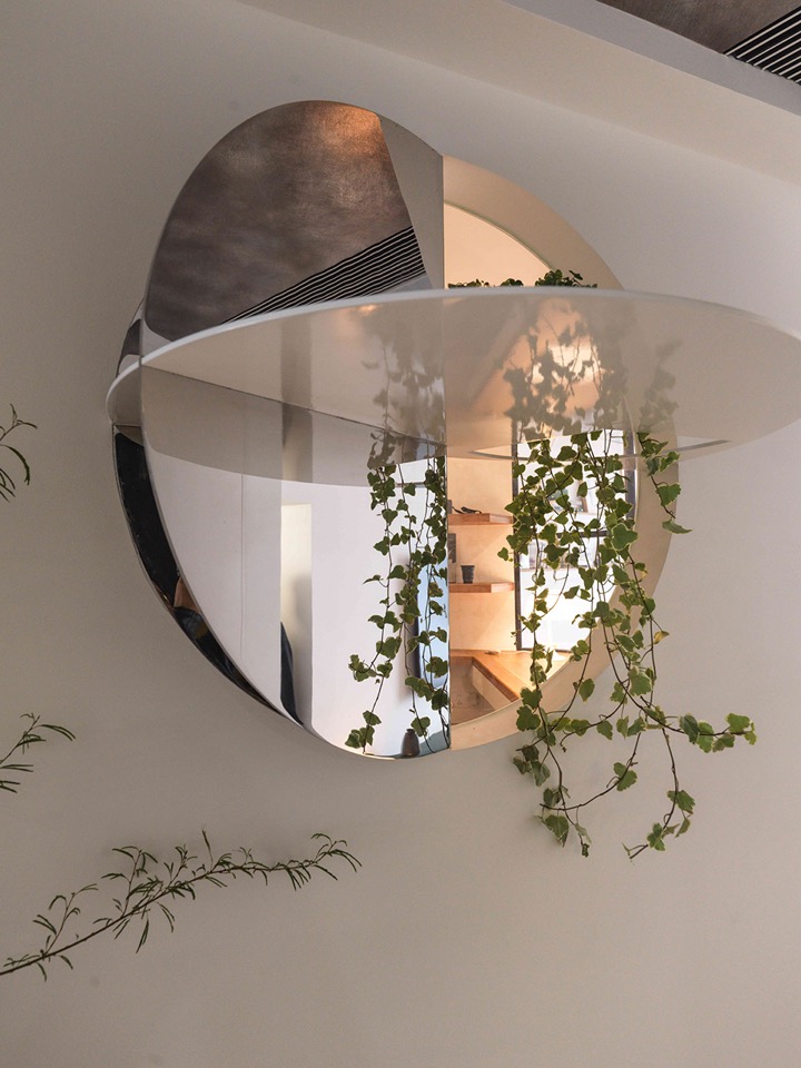 Programme drives zoning; zoning imposes limits; limits generate enclosure; enclosure demands relief. Beyond the bubble porthole, the child-room glass box and the dining niche, the most singular aperture is the mirror-shrine window facing the entrance. Half void, half mirror: alternating strips of mirrored and white-lacquered stainless steel form a vertical “mirror-niche.” Two semi-circular shelves meet at an acute angle, avoiding frontal reflection. A pot of Japanese Snow-rose spills its branches through a fan-shaped slot. The mirror doubles the surrounding foliage; the circle transmits the Cocoon’s lamplight; leaves overlap in motion like pages of an animated album. Below, a triangular-section pedestal holds a dense Acacia, answering the shrine across the void. The dining table is bespoke; the banquette backrest, paneled with vertical louvres, and the green semi-circular tiles of the sideboard conspire to domesticate the act of gathering. In the bilateral window a single Island Spring orchid thrusts a branch sideways into the lane.