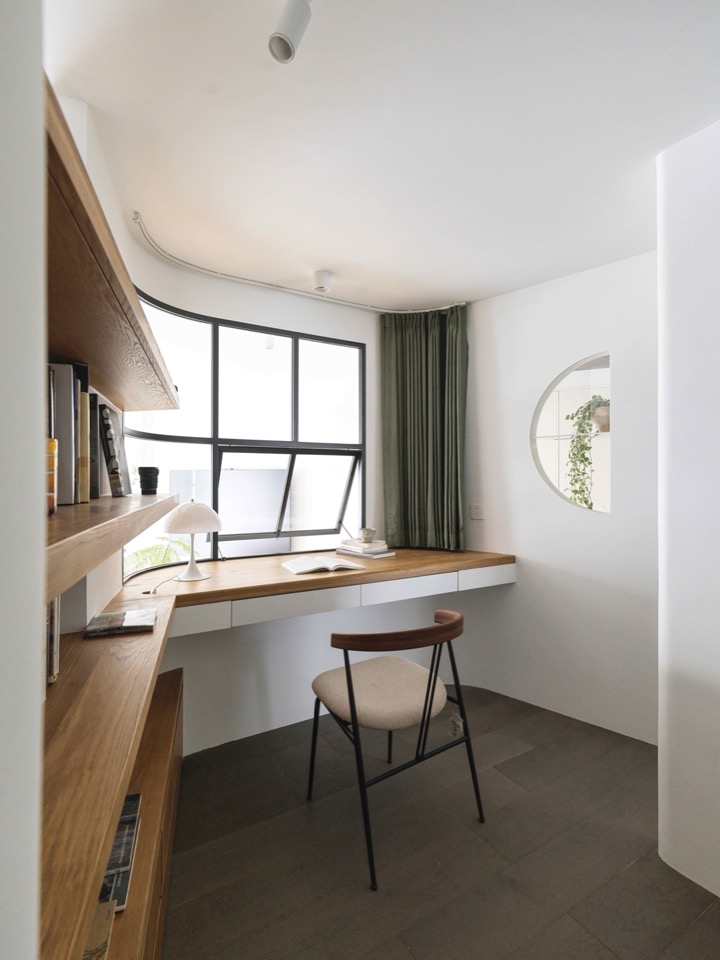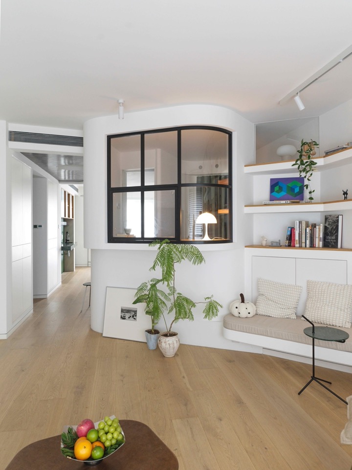 Thus the Cocoon migrated south, grew plump and smooth, and at last became a true “cocoon.” “Roundness” was not literally circular: small fillets on folded planes—easy for builders to set out. The upper and lower halves were staggered, creating two entrances: one facing the dining-room, one to the master bedroom. One could now move from sofa to bed without entering the public corridor. The master door is barely shoulder-wide; the flank of the wardrobe acts as a shadow wall. The desk still surveys the living-room; a full-height bookcase climbs the east wall; a circular porthole, veiled by planting, is cut in the west wall, allowing the occupant to glimpse arrivals without being seen. Though minute, the Cocoon is complete: a hinge at the apartment’s centre, a belvedere. Its living-room window, top-hung and outward-opening, behaves like an external casement. Seated inside one feels, in Beijing parlour idiom, “the host of the house,” serenely commanding the whole. The husband, almost apologetically, listed his needs: “A small wardrobe in the bedroom; a coffee station in the dining-room. That’s all.”