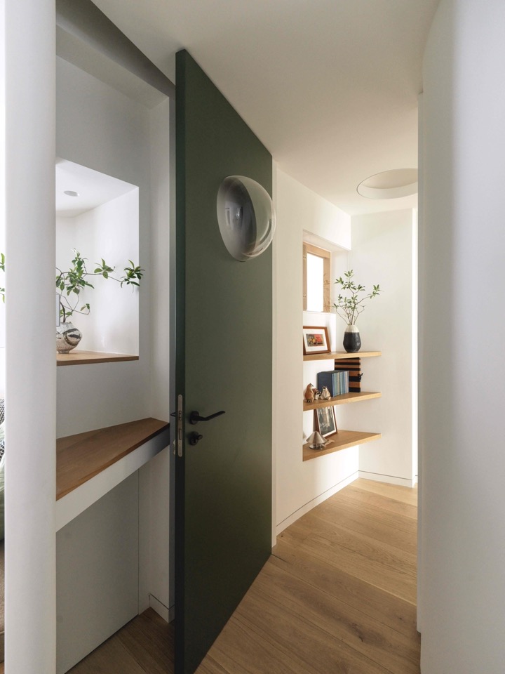 卧室门选在这个位置,也是考虑到行进节奏,进了门就是小走廊的第二段,转90度弯后面对卧室。这道墨绿色的门上装了一个半球体高窗,既保护了隐私,也让高处的光弥漫到两边,透一口气。东北角墙体折了三下,呼应拐弯的走势,其实背后嵌着马桶和吊柜。转过弯来进入小走廊的最后一段,这里做了一个有深度的拱,压低了空间,也让视野更远。进入卧室回过头看,通往小走廊的拱门和茧房朝向卧室的狭窄入口紧紧挨在一起,像两个神秘的洞穴,通往未知的所在。从卧室往外走的途中可以更直接的看到儿童房高窗和餐厅双侧窗,为了保证私密,高窗内置了折叠木隔板,隔音玻璃形成一个透明盒子,收纳了窗扇。