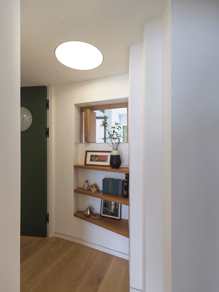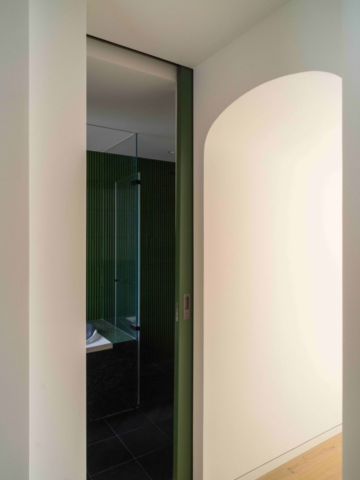 The door itself—dark green—carries a hemispherical glass bubble: privacy intact, yet upper light washes both sides. The north-east wall kinks three times, echoing the turn while concealing the WC and an overhead cabinet. A final arch compresses the head; beyond it the bedroom suddenly opens. Looking back, one sees two mysterious apertures side by side: the arch to the lane and the narrow mouth of the Cocoon—caves leading to unknown realms. Along the return journey the child’s clerestory and the dining-room’s bilateral window are more directly visible; folding timber shutters inside the double-glazed box preserve privacy.