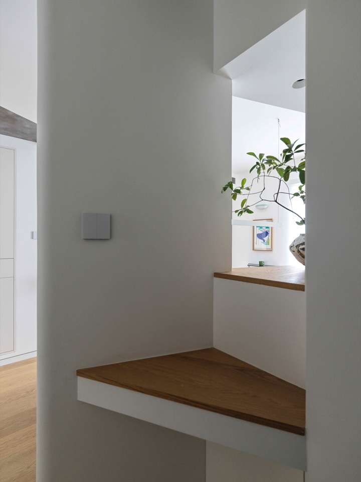 茧房的宽度是由两个条件决定:客厅东墙北侧顶点的位置,和周围通行的宽度。正是这些极限尺寸,塑造了从玄关和餐厅通往主卧的小走廊的形式。从起点到终点,要绕一个回头弯,超过180度,这在住宅中是不寻常的。之前说过,主人不喜欢普通户型中的L形黑走廊。既然无法解决这个矛盾,就反其道而行之,继续延伸它的长度、打磨它的造型,人为制造节奏感,让“通行”成为一件有趣的事。