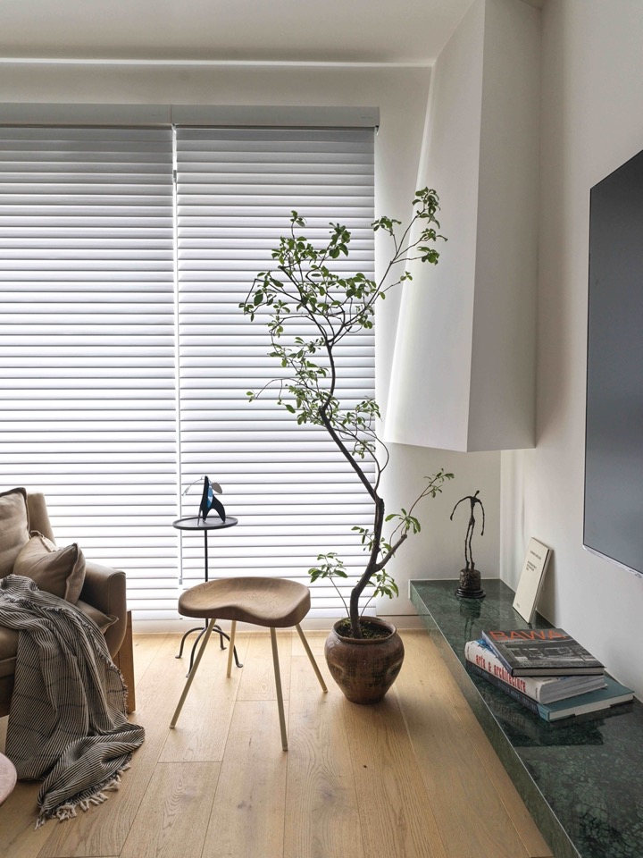 To animate this “domestic garden” we distributed plants with curatorial precision. A larger Island Spring greets the entrance; behind the sofa, Florida philodendron and Alocasia green velvet; where the piano once stood, a jacaranda paired with Alocasia zebrina; above, a tri-coloured hoya cascades from a shelf, conversing through glass with the Cocoon’s lantern. A two-seat alcove at the north-east bookcase reinforces the window’s “outdoor” quality. Corridor turns sport Syngonium, child-door sentry is a ZZ plant, second bedroom owns sea-grapes, master bedroom shelters Archidendron. Greenery flickers at thresholds, corners, window-heads—an inadvertent luxuriance.