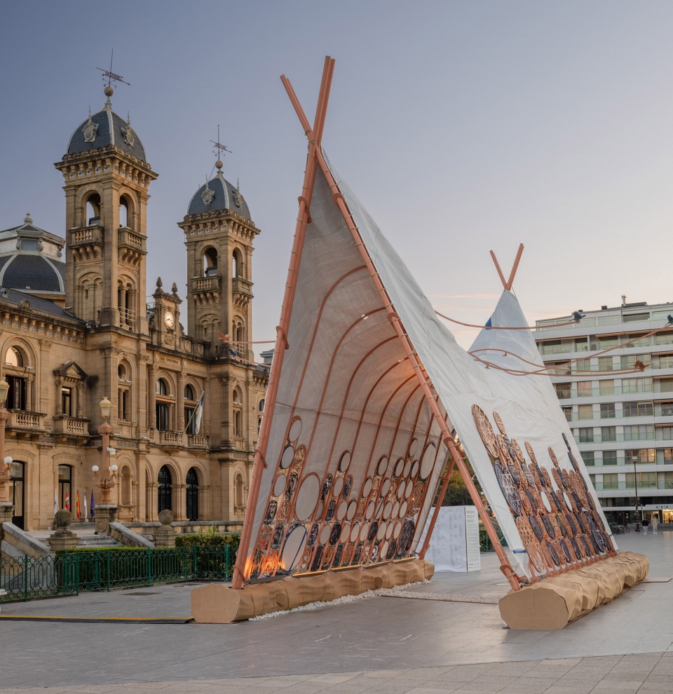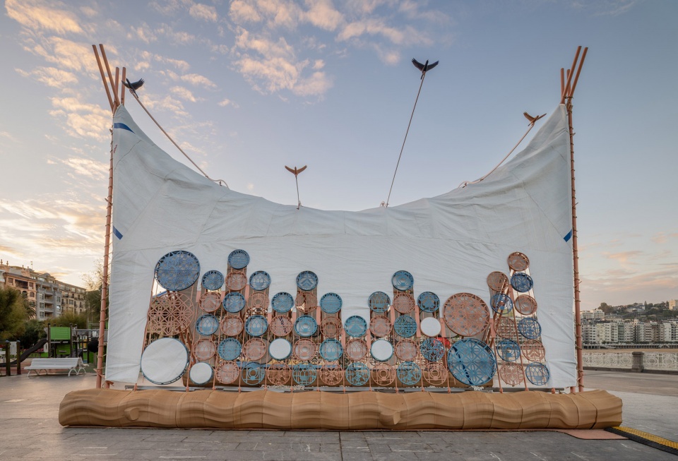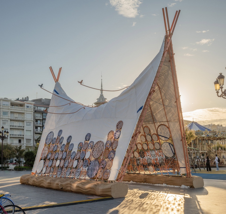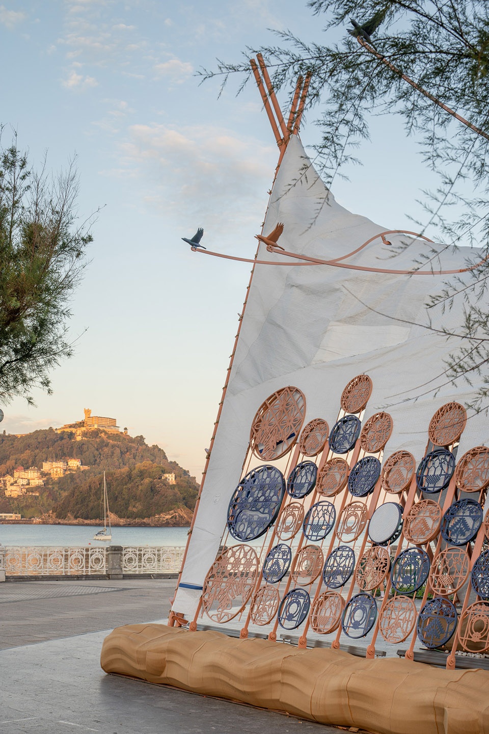 In our pavilion, we use 3D printing technology to create a series of hoops that reproduce traditional Basque embroidery patterns, while also incorporating motifs of political awareness. These embroideries raise awareness of pressing issues such as rising housing prices, the threat to urban pollinators, the deterioration of marine ecosystems, individual responsibility in caregiving, the effects of mass tourism in San Sebastián, and gender inequality in access to the architectural profession. Today, works such as A Little Book of Craftivism (2013) and How To Be A Craftivist (2017) by Sarah Corbett offer a different kind of revolution: citizens who cease to be merely, or primarily, consumers. Our pavilion, constructed for the Mugak/2025 Biennale, is designed to serve as a forum for the exploration of utopias. Rather than simply representing an idea, it invites citizens – especially women, older people, children, and caregivers – to express themselves collectively through the act of stitching. Each thread, message and symbol represents a collaborative effort to imagine the future.