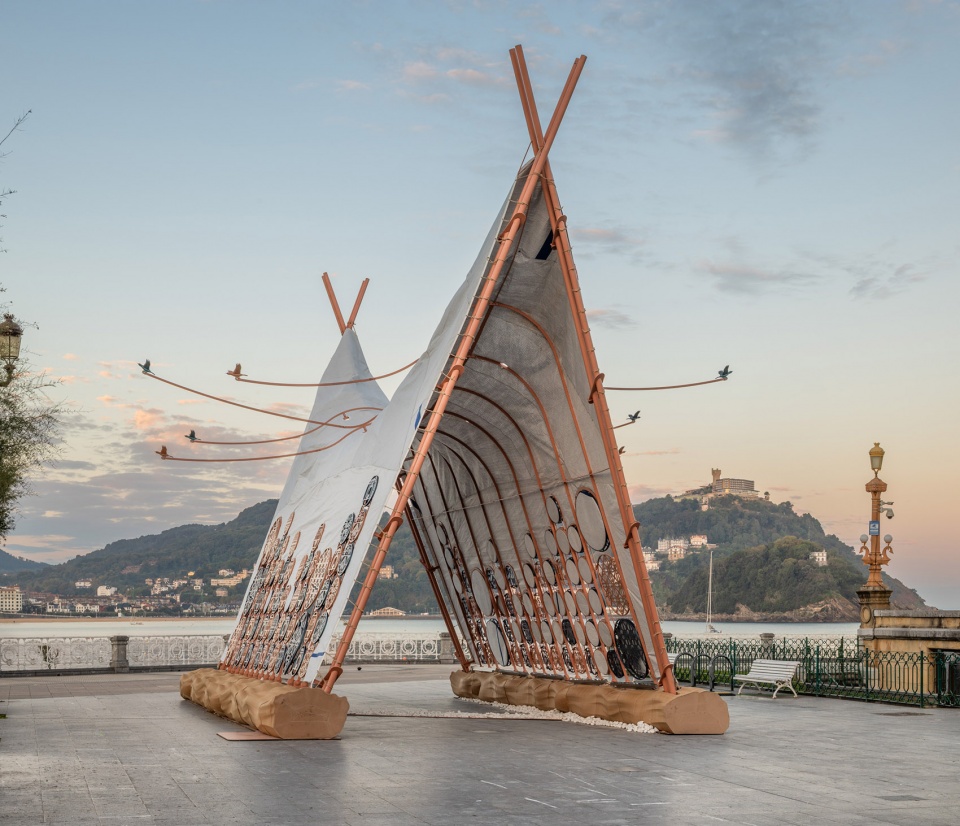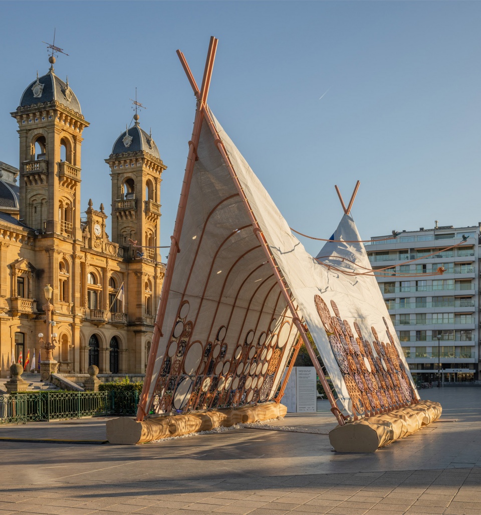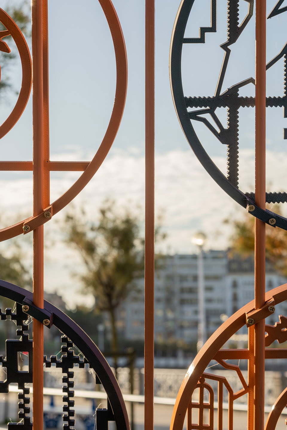 In our pavilion, we use 3D printing technology to create a series of hoops that reproduce traditional Basque embroidery patterns, while also incorporating motifs of political awareness. These embroideries raise awareness of pressing issues such as rising housing prices, the threat to urban pollinators, the deterioration of marine ecosystems, individual responsibility in caregiving, the effects of mass tourism in San Sebastián, and gender inequality in access to the architectural profession. Today, works such as A Little Book of Craftivism (2013) and How To Be A Craftivist (2017) by Sarah Corbett offer a different kind of revolution: citizens who cease to be merely, or primarily, consumers. Our pavilion, constructed for the Mugak/2025 Biennale, is designed to serve as a forum for the exploration of utopias. Rather than simply representing an idea, it invites citizens – especially women, older people, children, and caregivers – to express themselves collectively through the act of stitching. Each thread, message and symbol represents a collaborative effort to imagine the future.