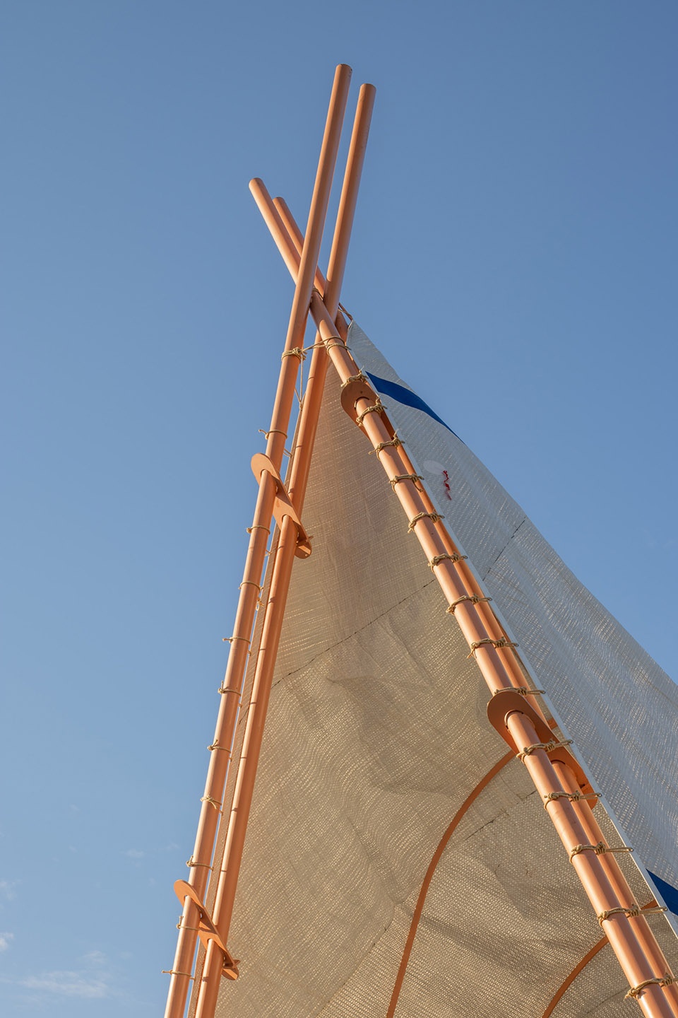 All materials used in our products, including those for 3D printing, are selected with the principles of the circular economy in mind. We use pellets and filament made from recycled packaging and ocean-cleaning plastics. The textile elements are made from recycled sailcloth. The pavilion’s structure and materiality thus embody a utopian concept: a circular production process in which industry is not a threat to the environment, but a guarantor of its preservation and regeneration.