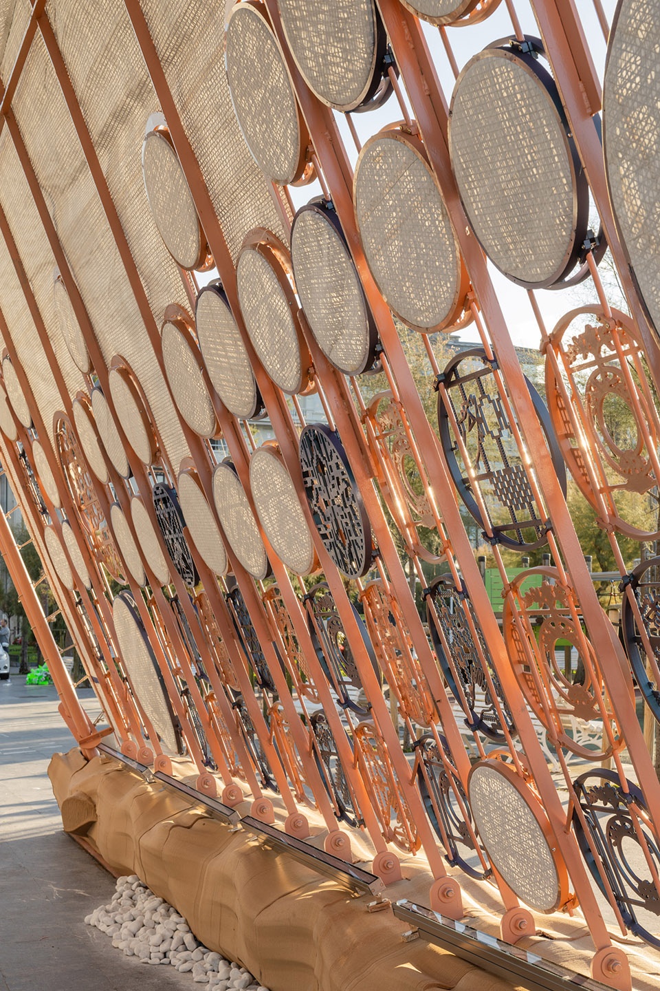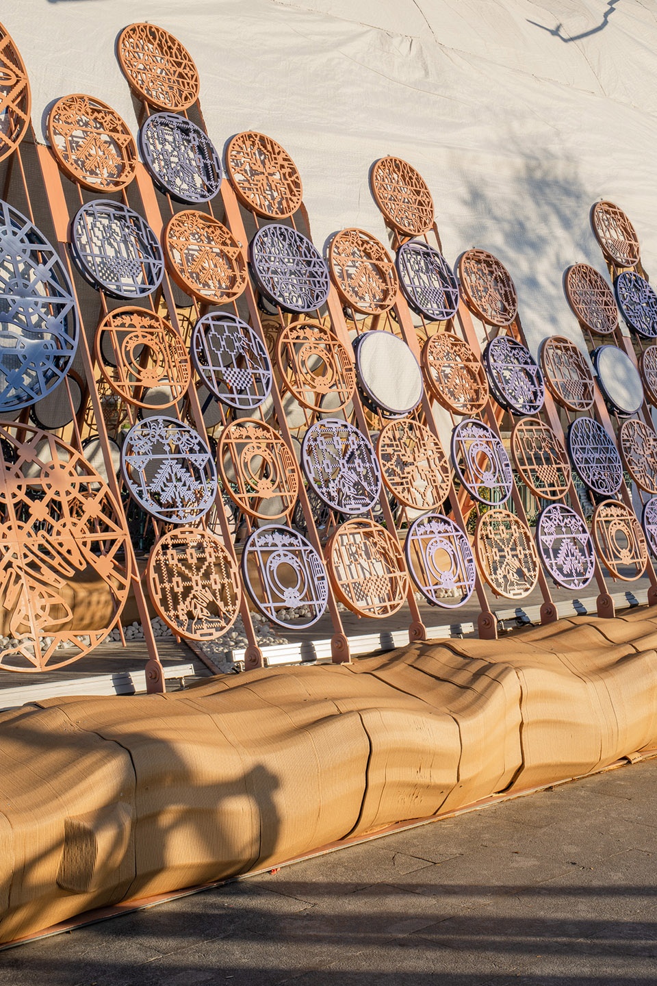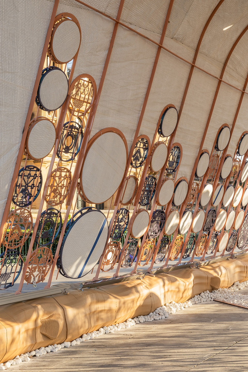 The pavilion incorporates advanced 3D printing technology, allowing for structural optimisation that minimises material use without compromising stability. The perforated roof modules are engineered to resist wind loads and evoke the embroidery of véhiculaire; their motifs include leaves, birds, and provincial shields, linking nature, identity, and collective desire. The embroidery patterns intentionally disrupt their regularity, serving as a reminder of pressing global issues such as over-tourism, housing crises, biodiversity loss, and marine degradation.