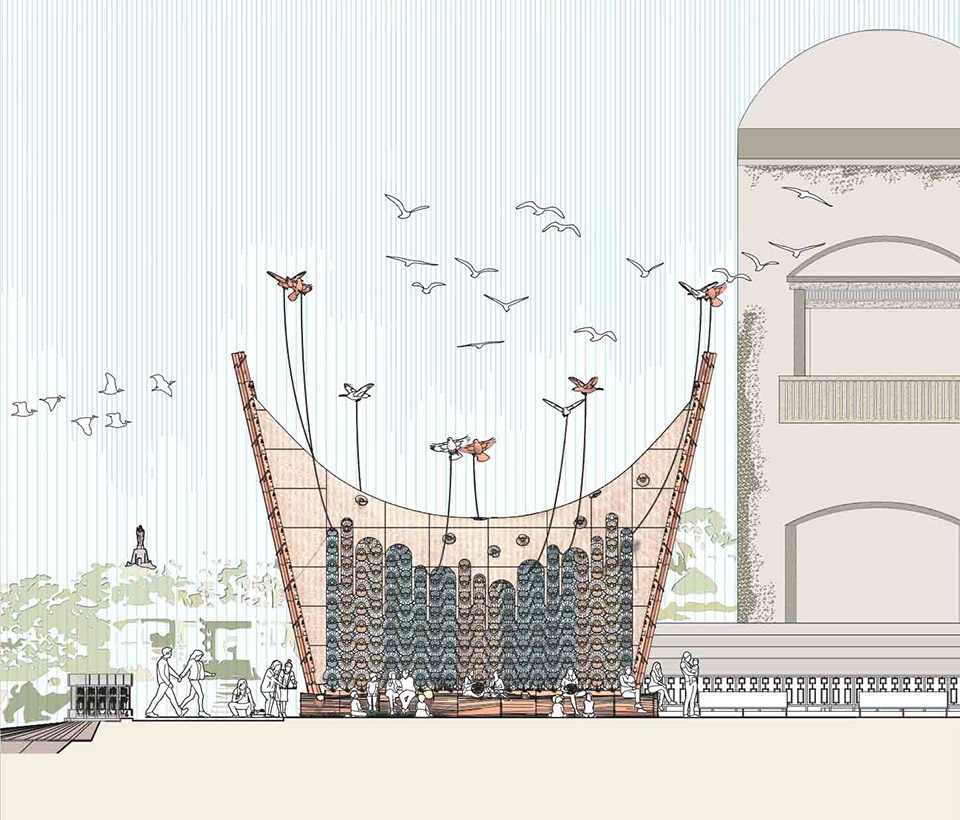 The pavilion has a clear social purpose as well as being symbolic. Its design allows for multiple uses that encourage participation and public expression.