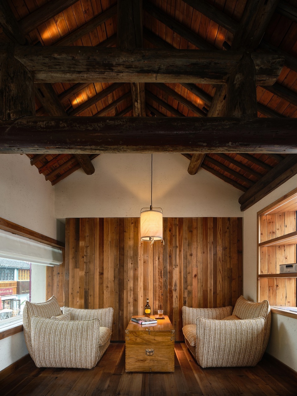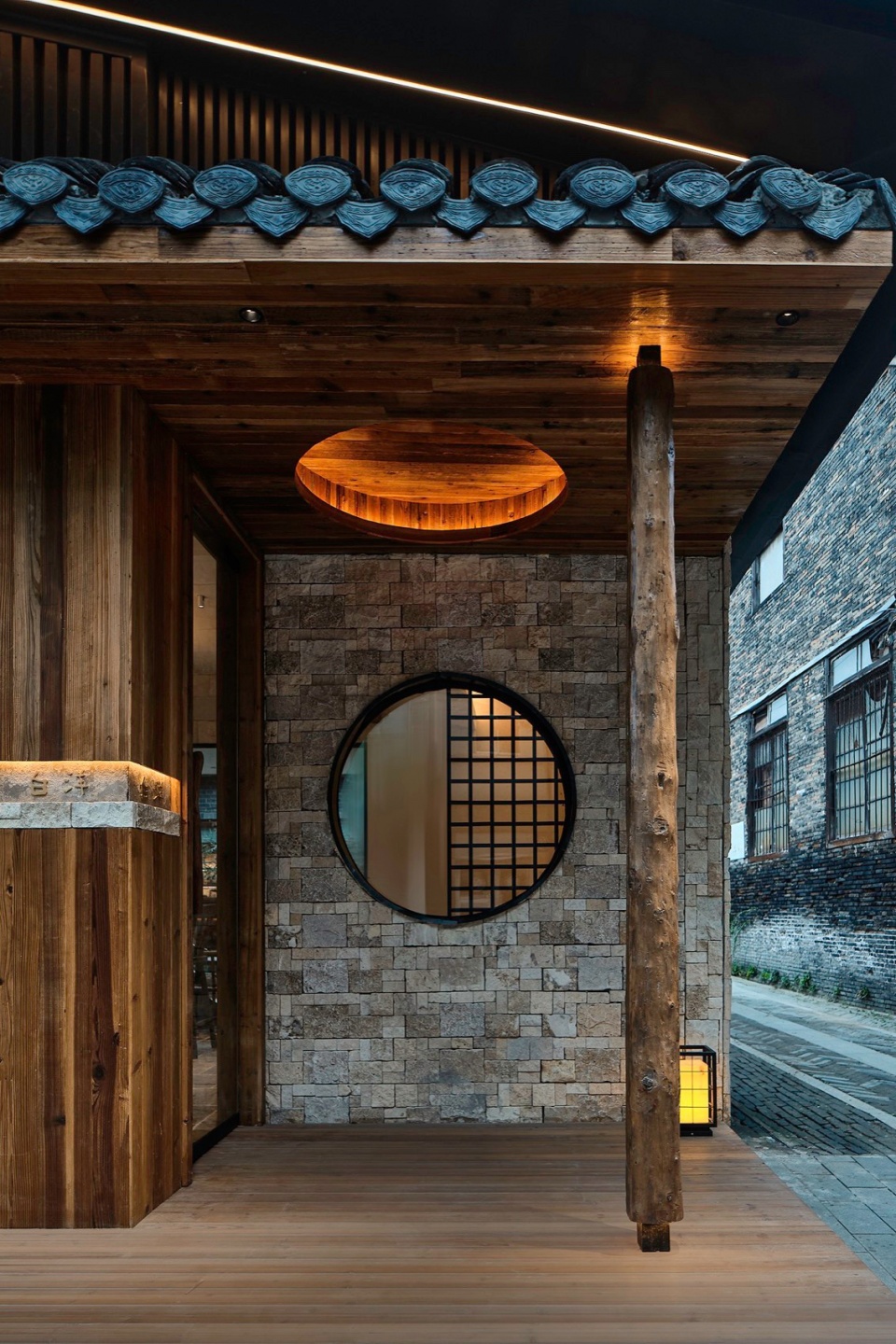 檐口点缀各地淘来的老瓦片,木石交错,灯光轻映;
