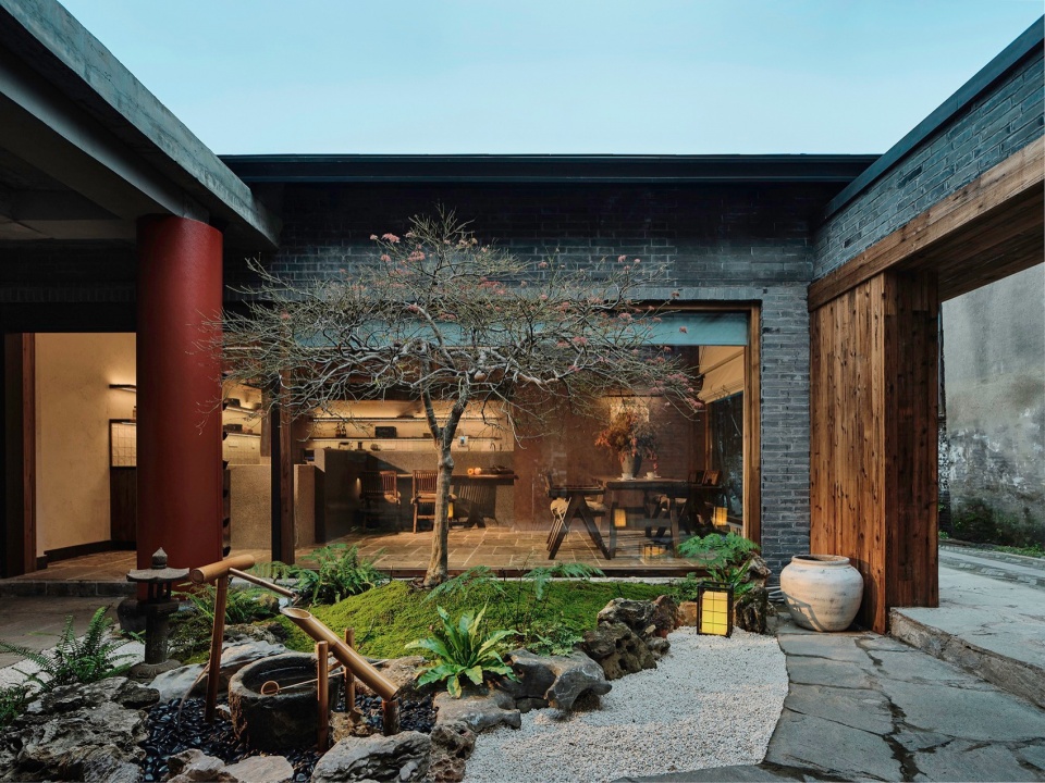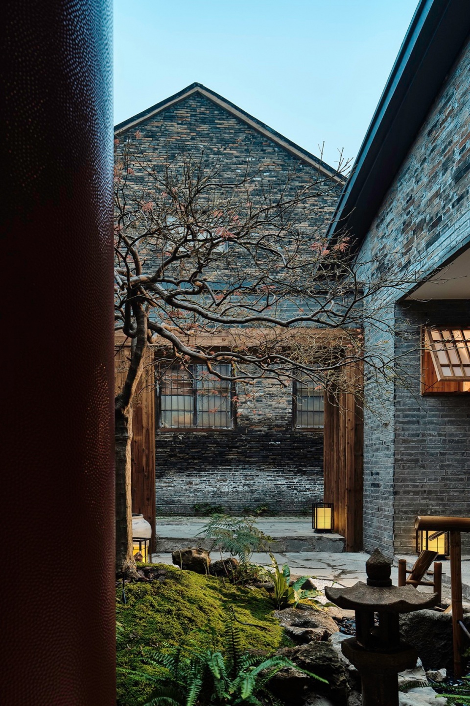 In the courtyard, flower stones, moss and lime stone paths crisscross each other. With each tree and each stone, there is still water in the courtyard. The texture of the materials extends underfoot.