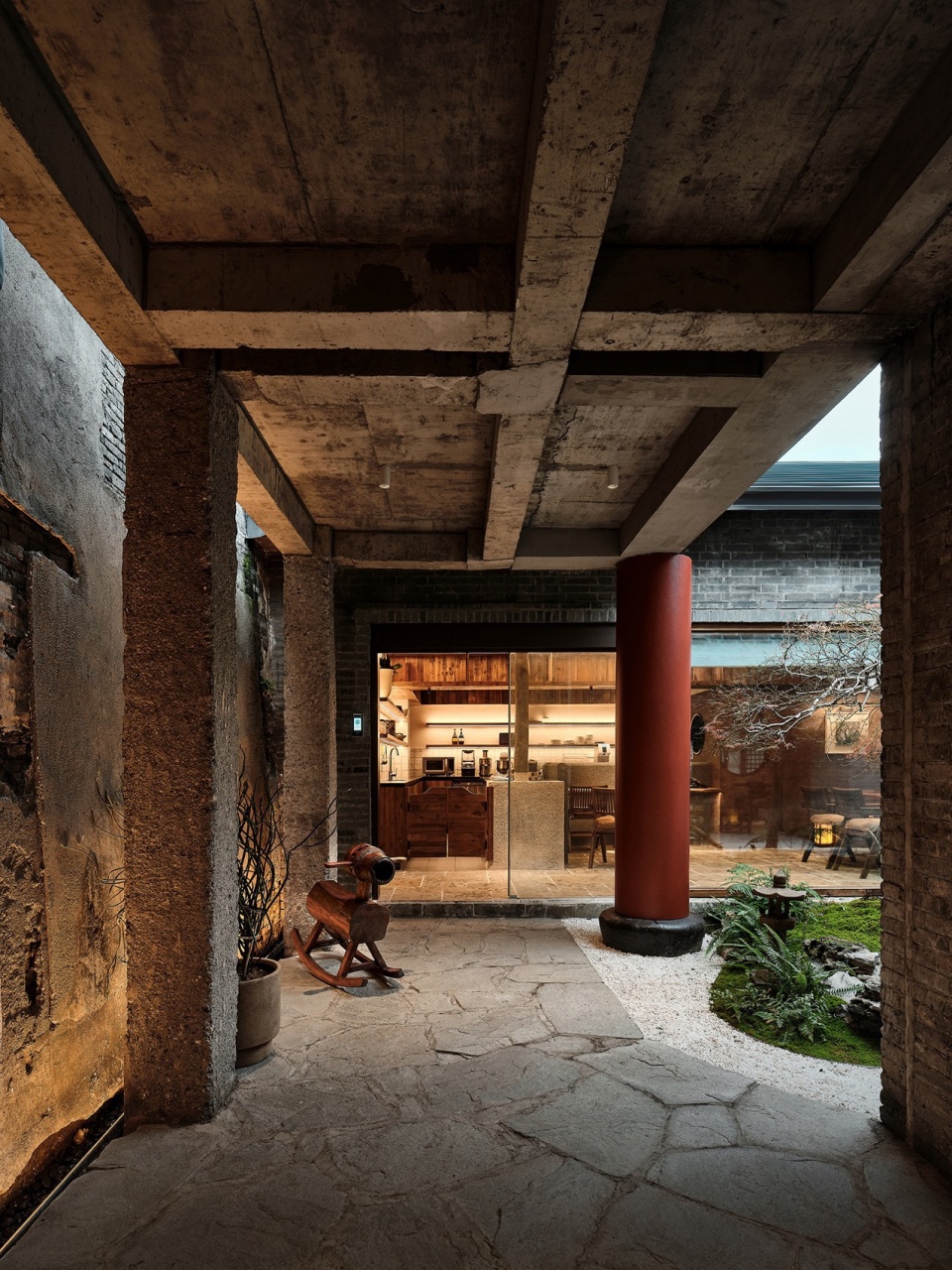 A paused viewing pavilion connects the corridor between the front and back areas. The old walls and moss marks are deliberately retained, and the beams and columns remain unadorned to maintain the original texture of the materials. The columns are wrapped in red stainless steel with ancient hammer patterns, defining this place as a “viewing pavilion” – allowing people to pause here and have a dialogue with nature.