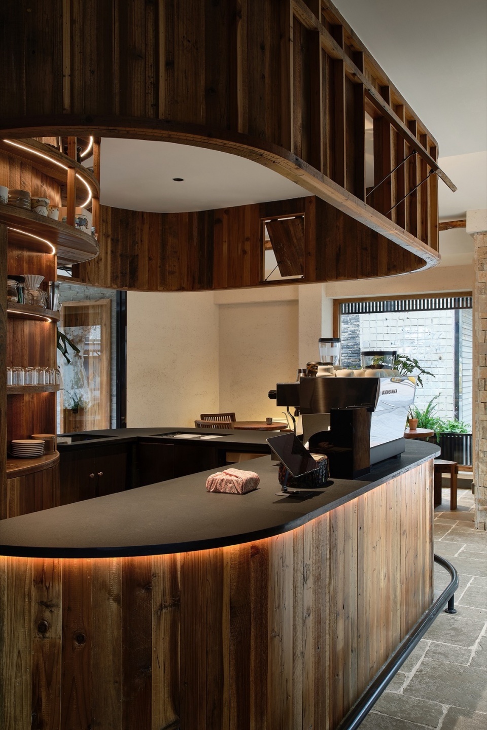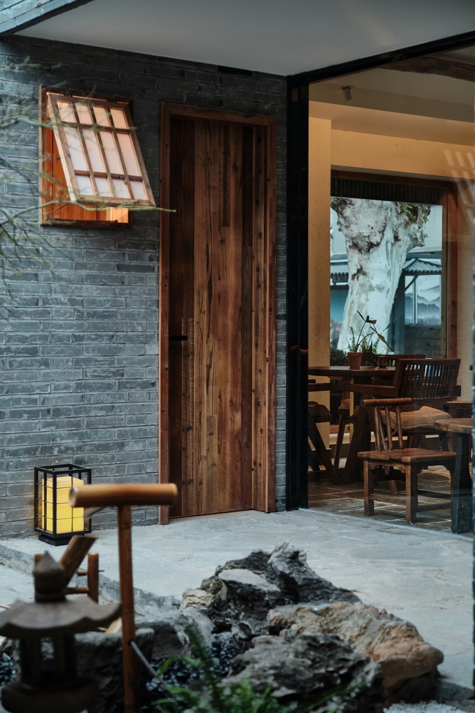 The exterior facade is painted with rammed earth paint, which is rough and simple. The eaves are dotted with old tiles picked up from various places, with wood and stones interlaced and light gently shining on them. At the entrance, an outdoor area made of old fir wood extends out. Under the paulownia trees, this place has become a “corner stop” that pedestrians are willing to stop by.