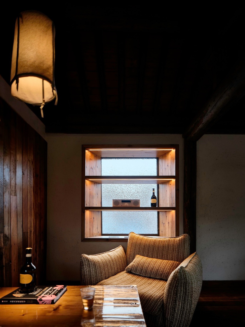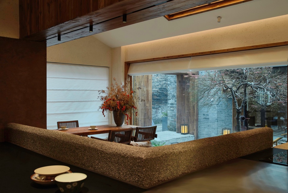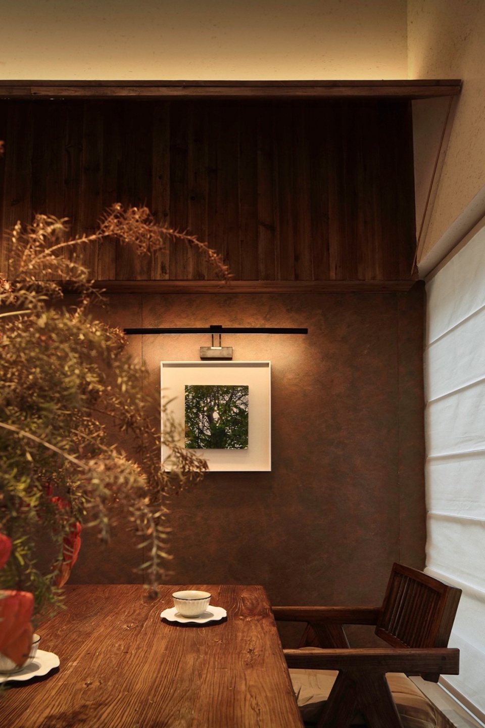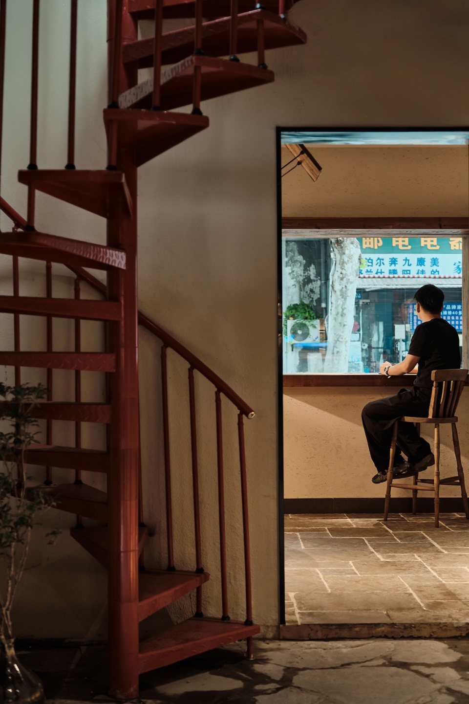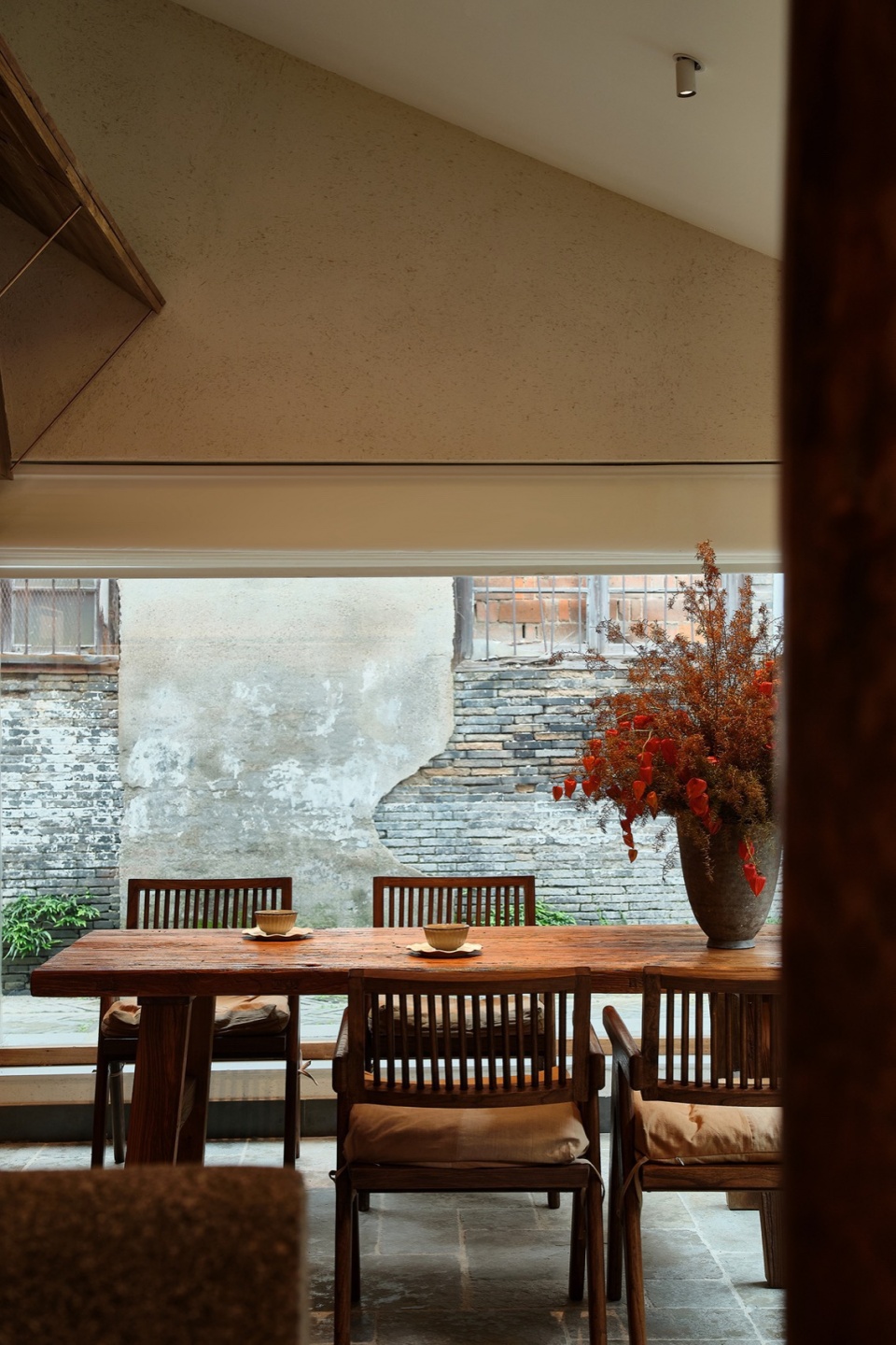 An old wooden stake serves as a structural fulcrum, supporting the narrative of the entire space. Through the window view, the mottled walls of the old town and the interior form a dialogue, with history and the present overlapping in the space.