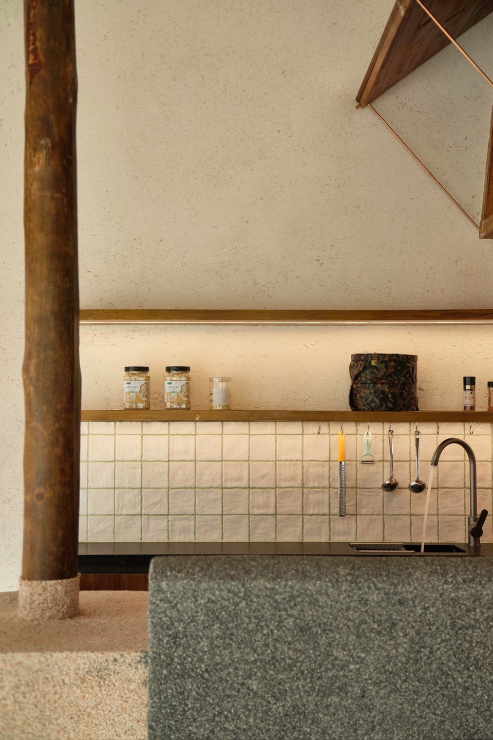 A Balance of Privacy and Openness The rear area is a dedicated space for baking and decorating. We continue to use the building’s sloping roof structure, simulating natural skylights to introduce light and illuminate the washed stone countertops and bamboo eaves.