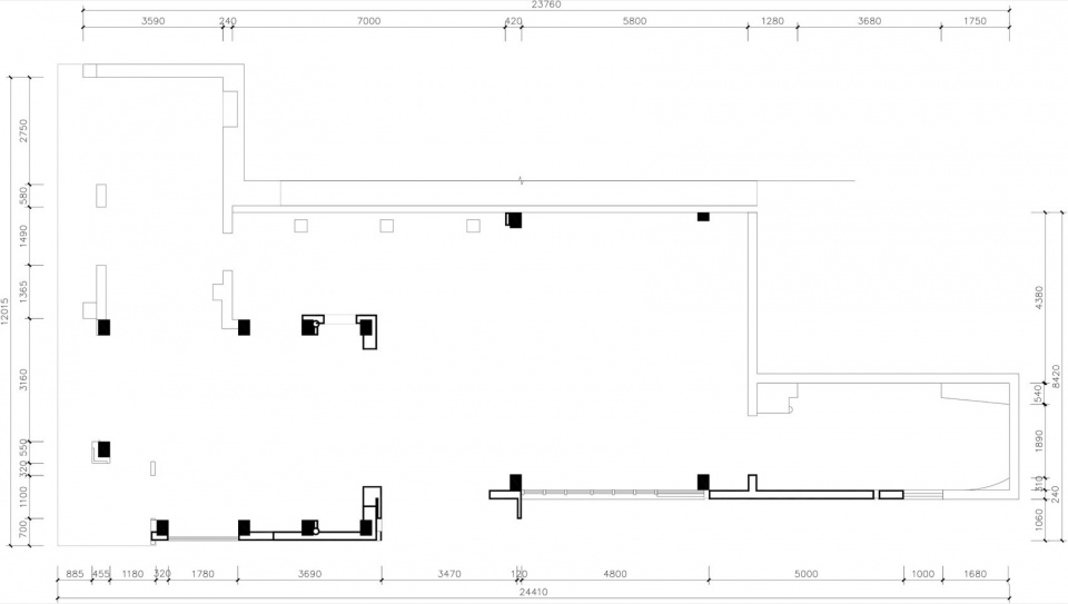 同样二楼未作过多修饰,射灯点亮顶部, 长虹玻璃轻掩老建筑遗留的残墙, 既保护了历史的痕迹,也不阻挡光线的漫入。