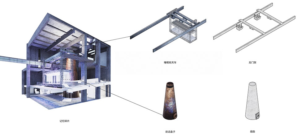 当建筑游离于本体之外, 创造出有别于主体功能的承载幻象的异样空间, 这一异托邦式的幻象空间,就是建筑定义的“剧场”。所谓城市剧场,时而位于屋檐之中,时而躺露屋面,时而依附高窗,时而长出窗外,成为戏剧盒子。每个厂区建筑,除了被赋予的文旅功能,都贡献楼体的一部分构筑一系列微型的异托邦:一个平行于现实世界的反思空间。而这些微型异托邦连在一起,又形成了一个现实之外的场域:一个变压工场景框之下的戏剧都市。当人们在这异样的场域中穿梭的时候,不经意间,人们穿过了城市与生活的剖面。
