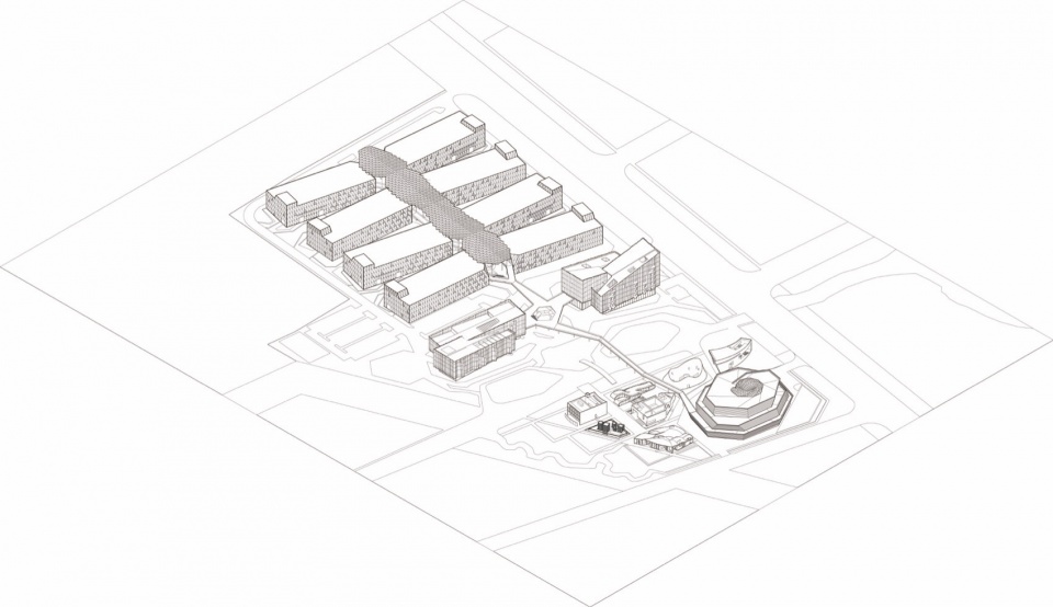 ▼总部与生活楼概念图,Headquarters and living quarters concept