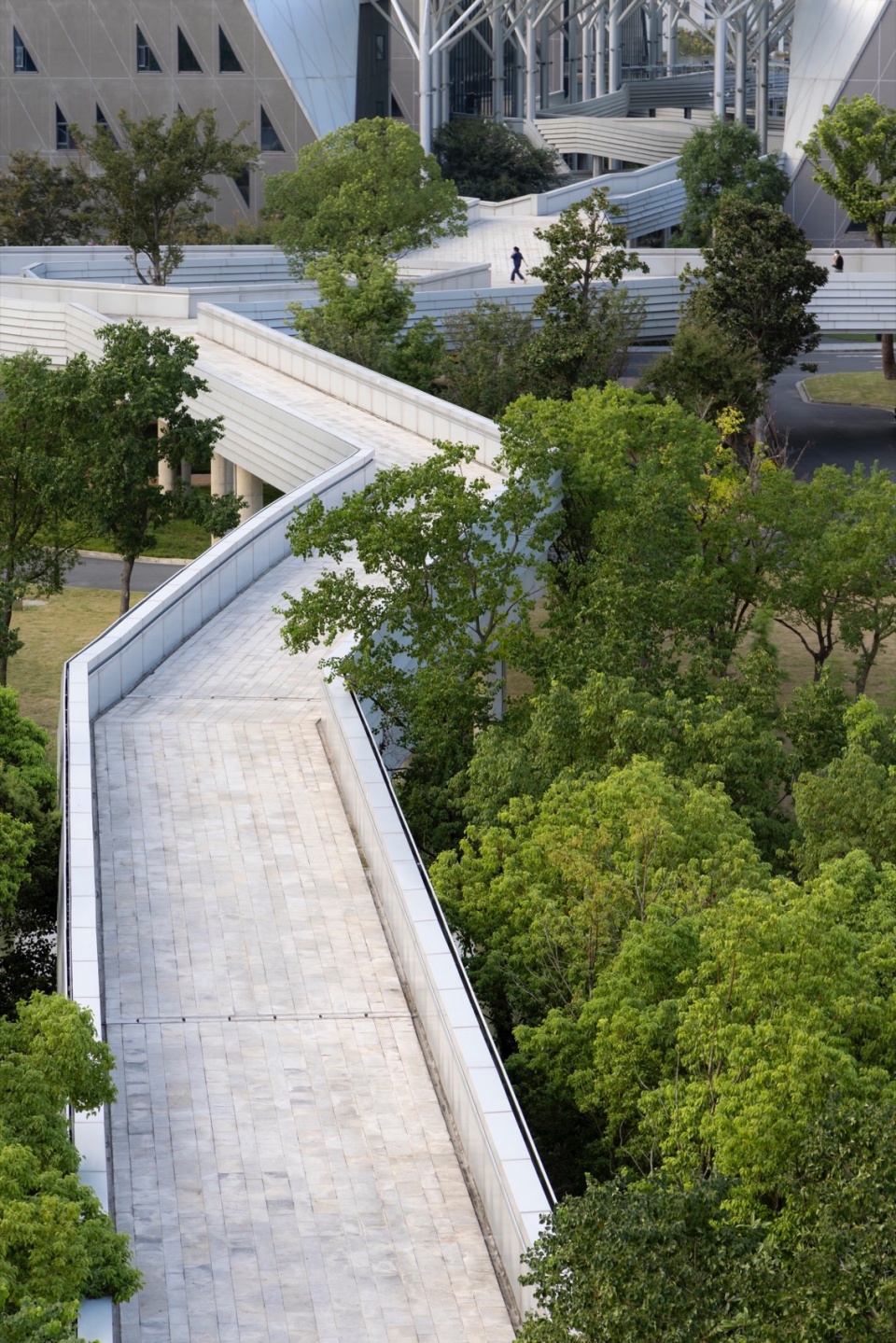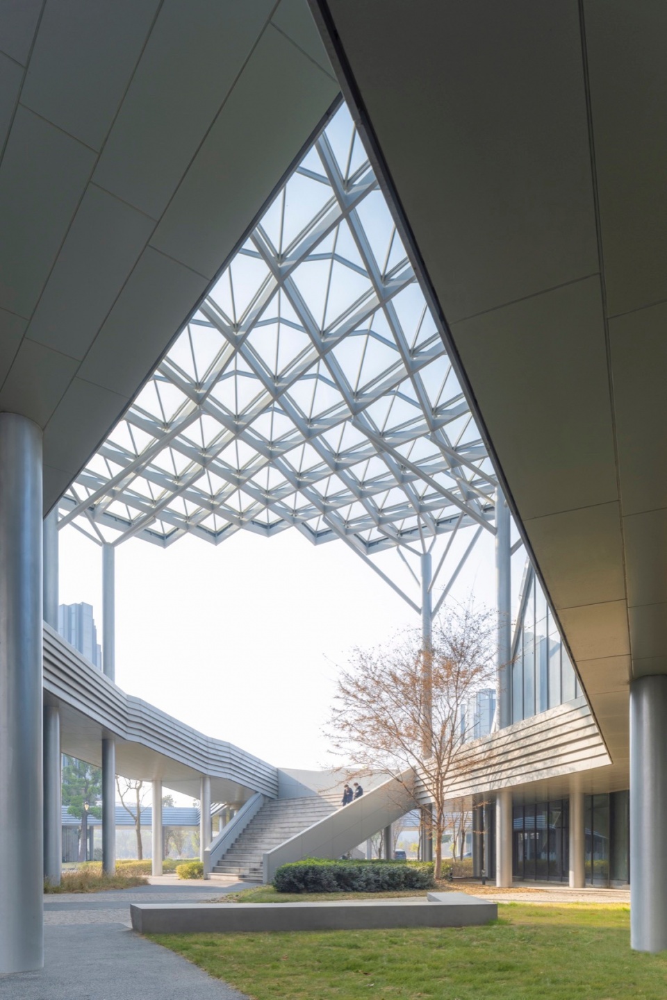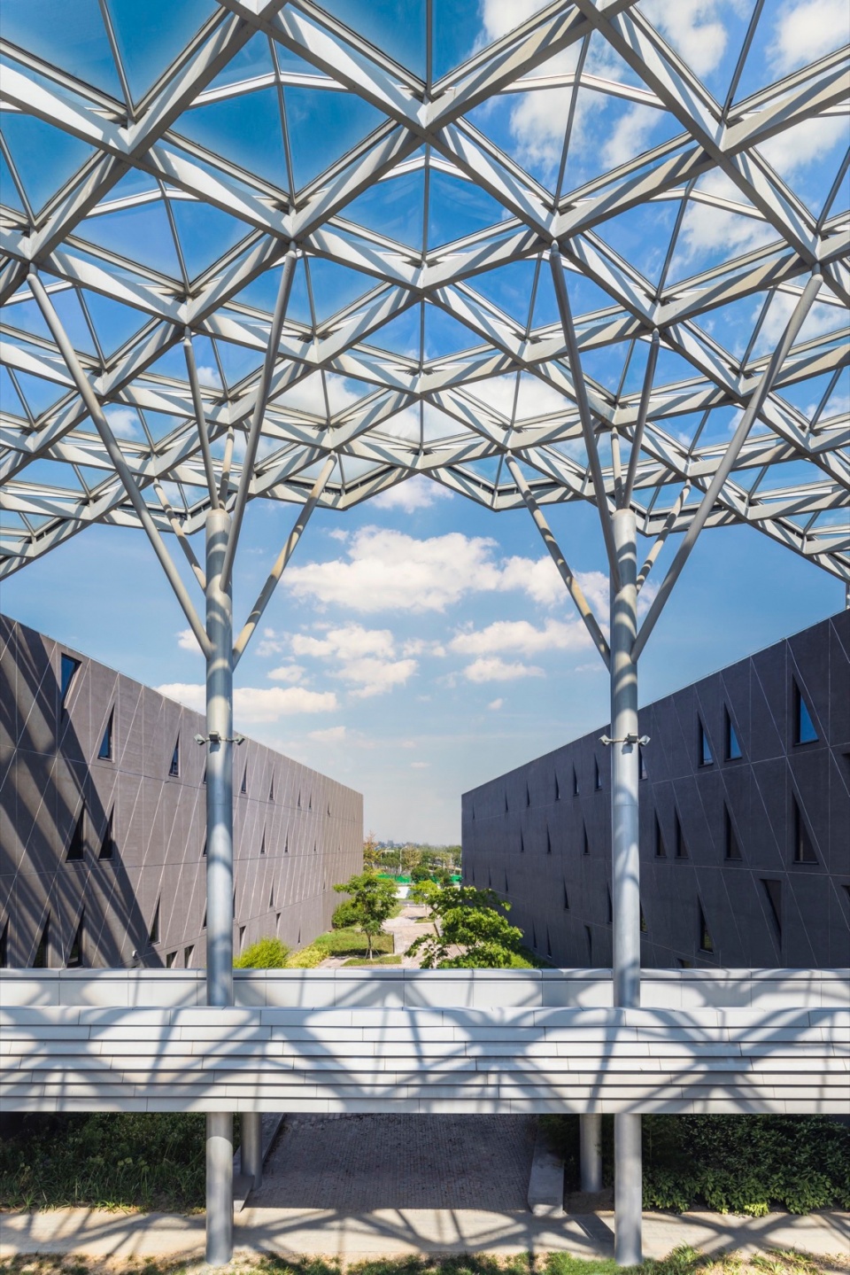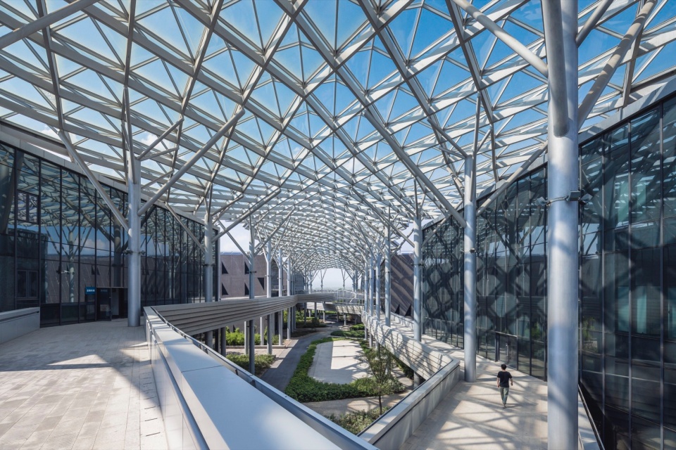 The campus’s large canopy and continuous aerial galleries employ lightweight structural design. The central corridor is covered with a transparent steel-framed glass curtain wall—providing shelter from rain while maximizing natural light and ventilation, creating a bright, comfortable transitional space.