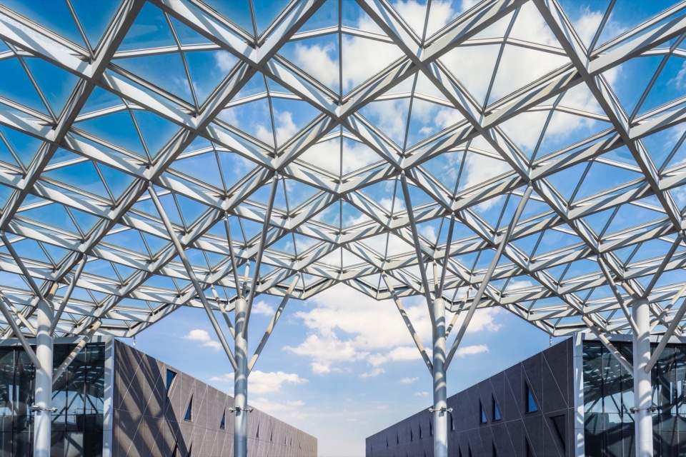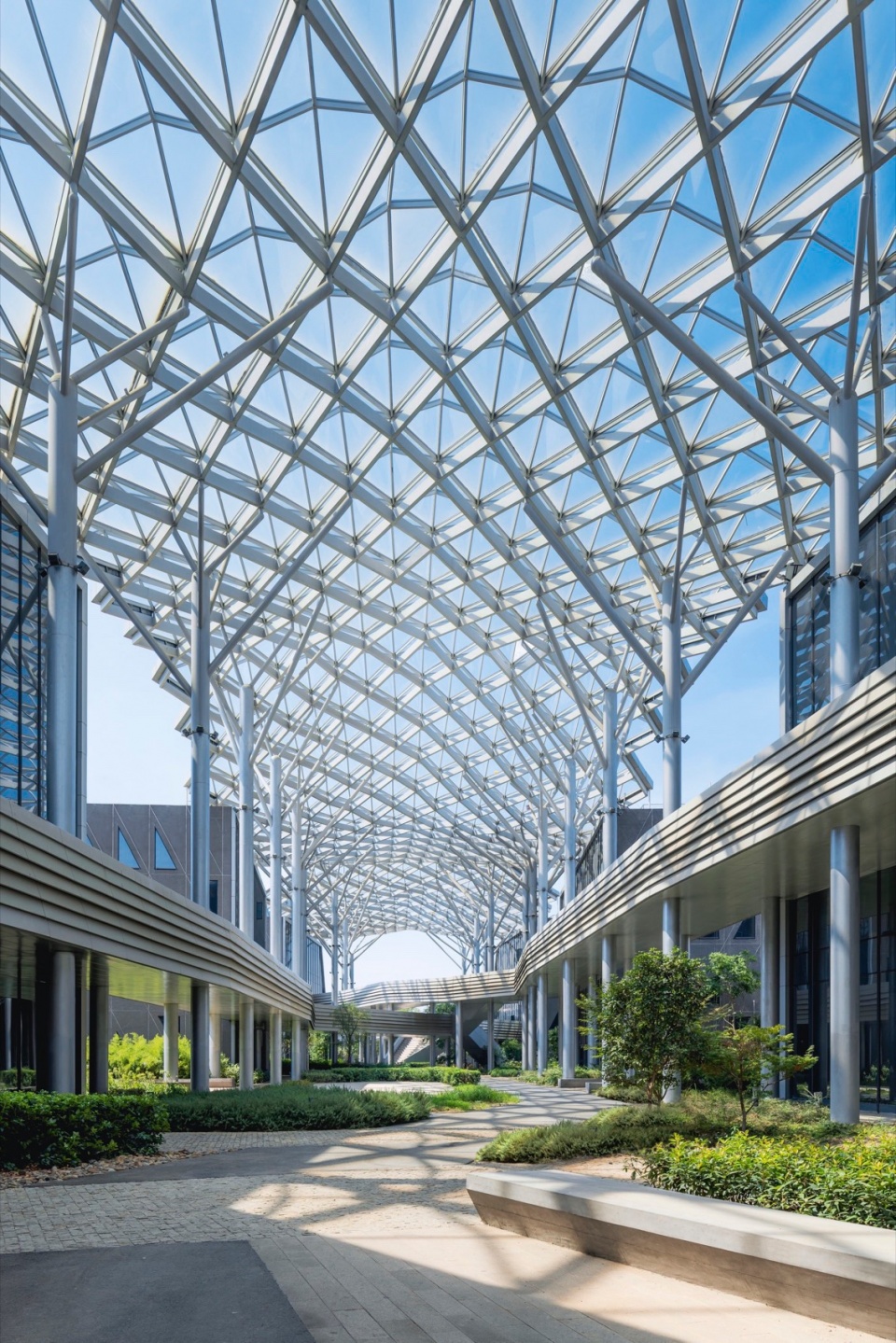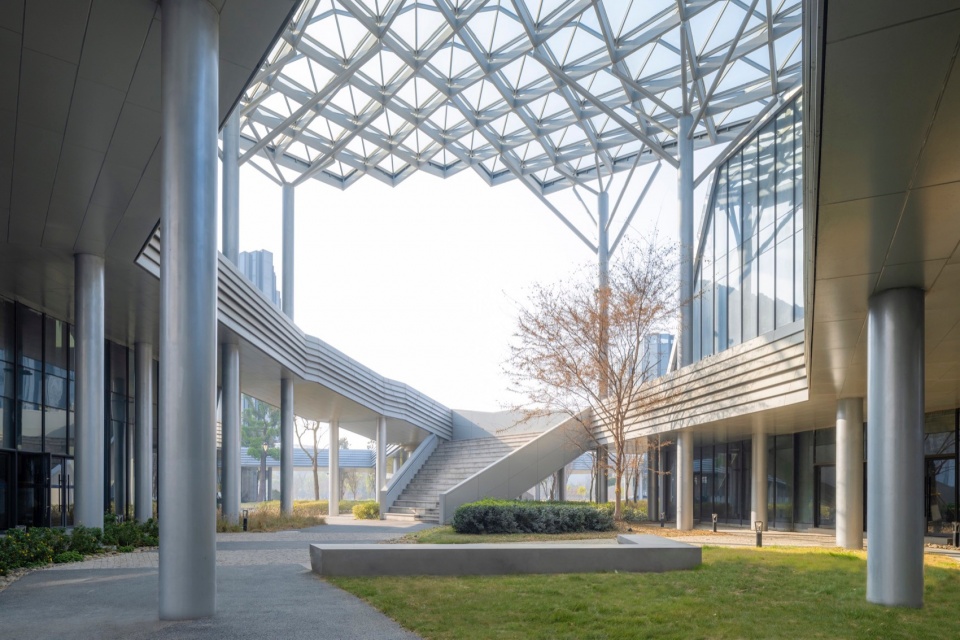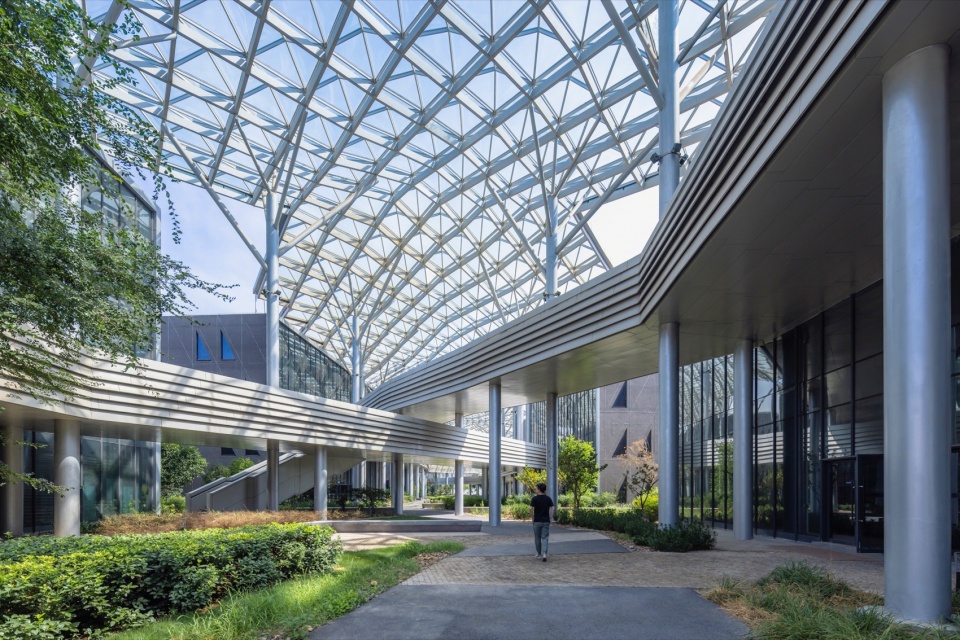 园区内的大型天棚与连续空中回廊采用轻型结构设计,中央走廊上方覆盖透明钢构玻璃幕墙—既保障了遮雨的实用功能,又最大化引入自然采光与通风,构建出通透舒适的过渡空间。