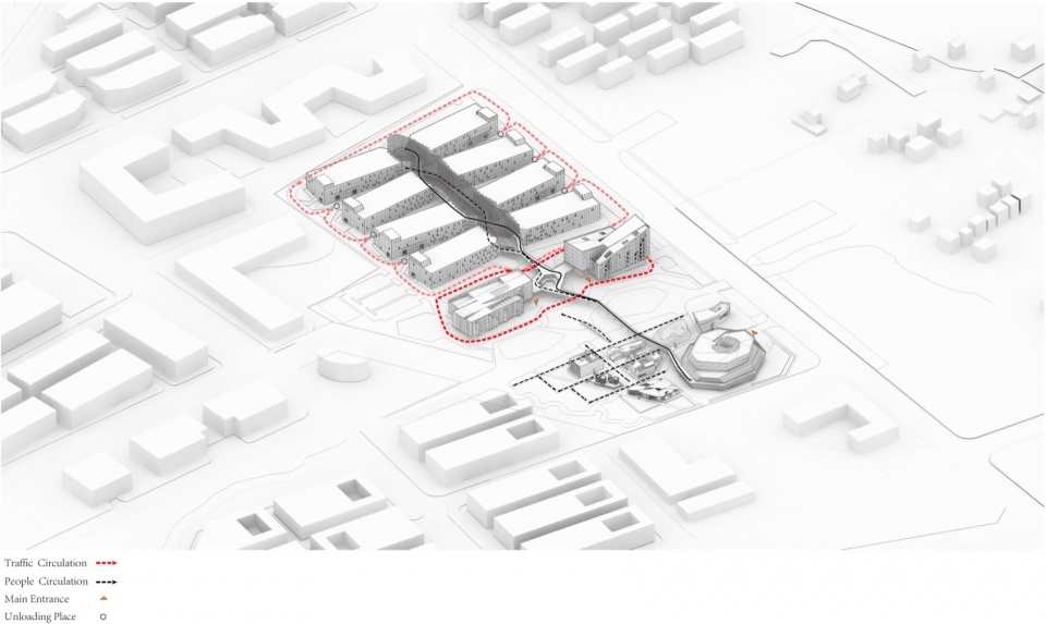 Furthermore, the interlocking forms of the east and west buildings enclose a spacious ground-floor lobby—a public core for gathering and interaction. Mid-level and rooftop formed by vertical misalignments create interior courtyard gardens, introducing greenery into the building and expanding open activity areas, infusing functional space with natural vitality.