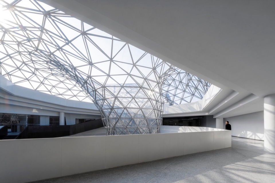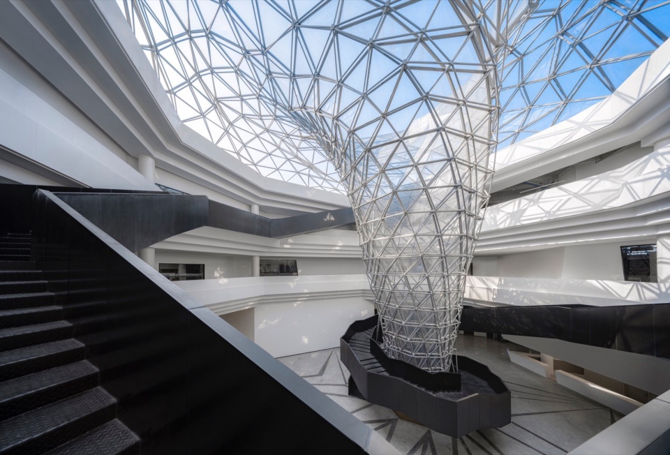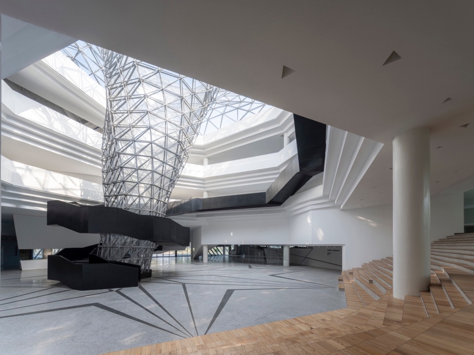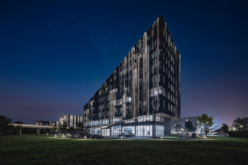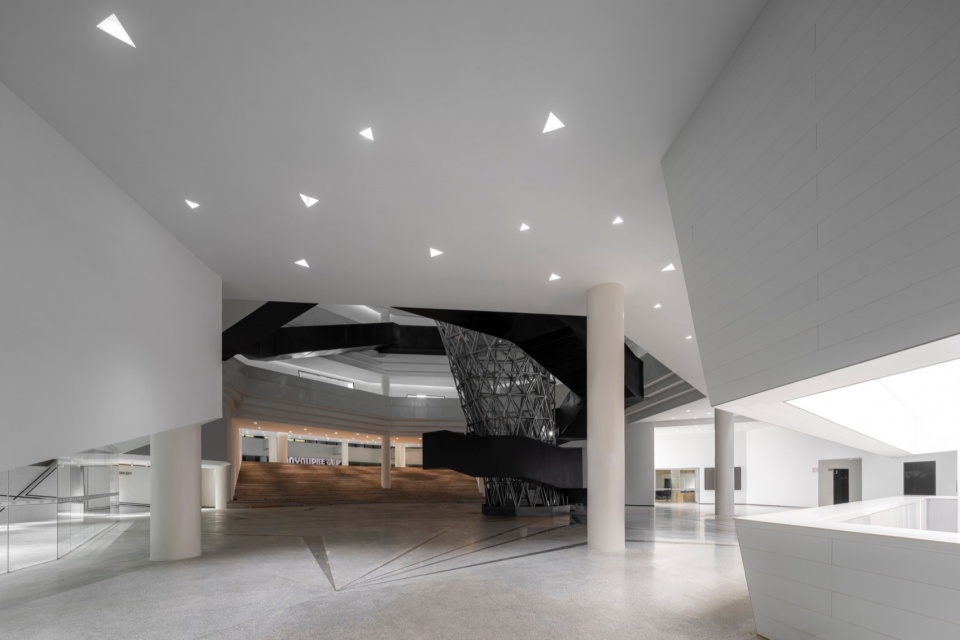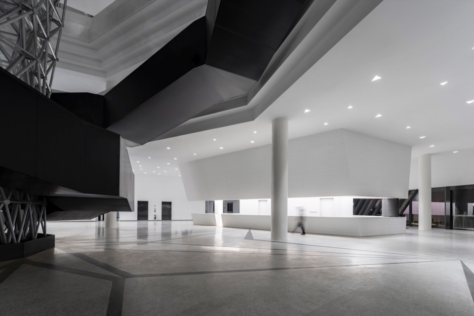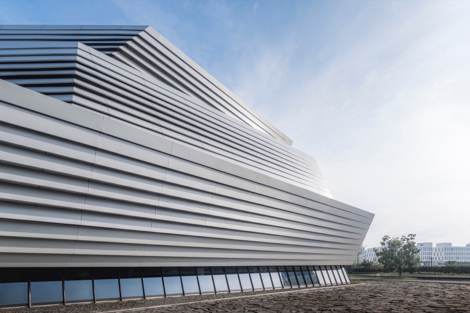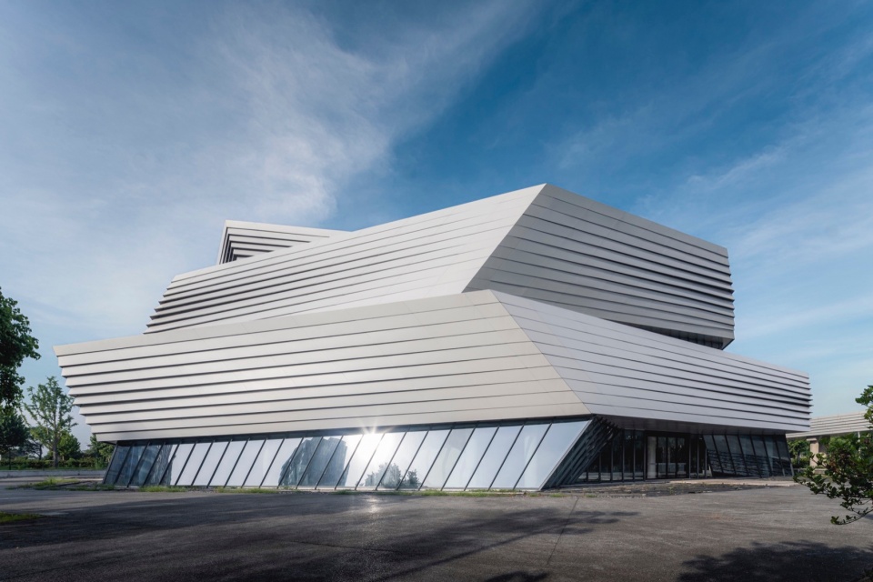 The facade design draws inspiration from the “axe-cut” texture in Chinese ink painting, combining with the southern waterfront characteristic to convey an Eastern landscape artistic conception. Balancing artistic interest and practicality, a folded louvered curtain wall was chosen: its folded texture echoes abstract landscapes, and the interplay of solid and void creates dynamic ambiguity, presenting a transparent, indeterminate image. Functionally, the undulating building surface provides efficient insulation and blocks light pollution while maintaining viewing sightlines from any angle. Indoors, light reflects between panels, creating diffused illumination and maintaining brightness.