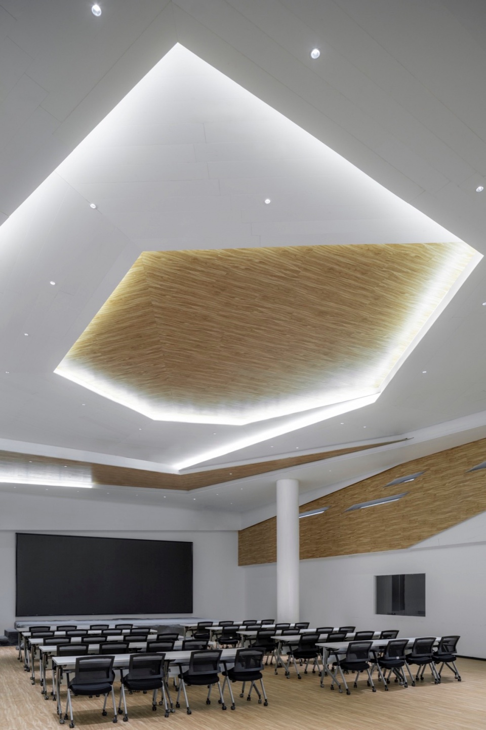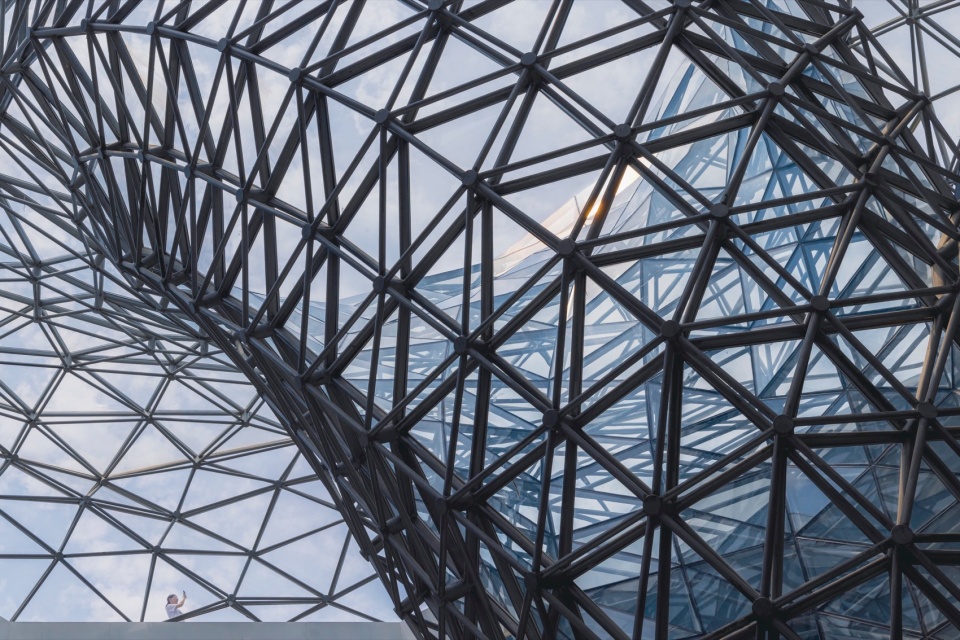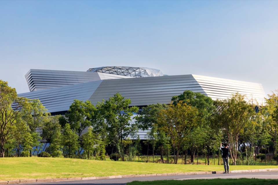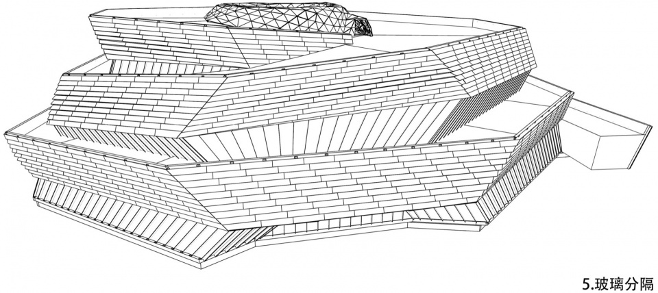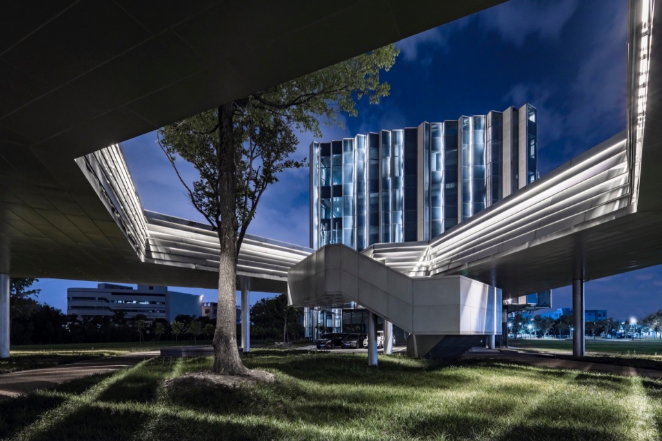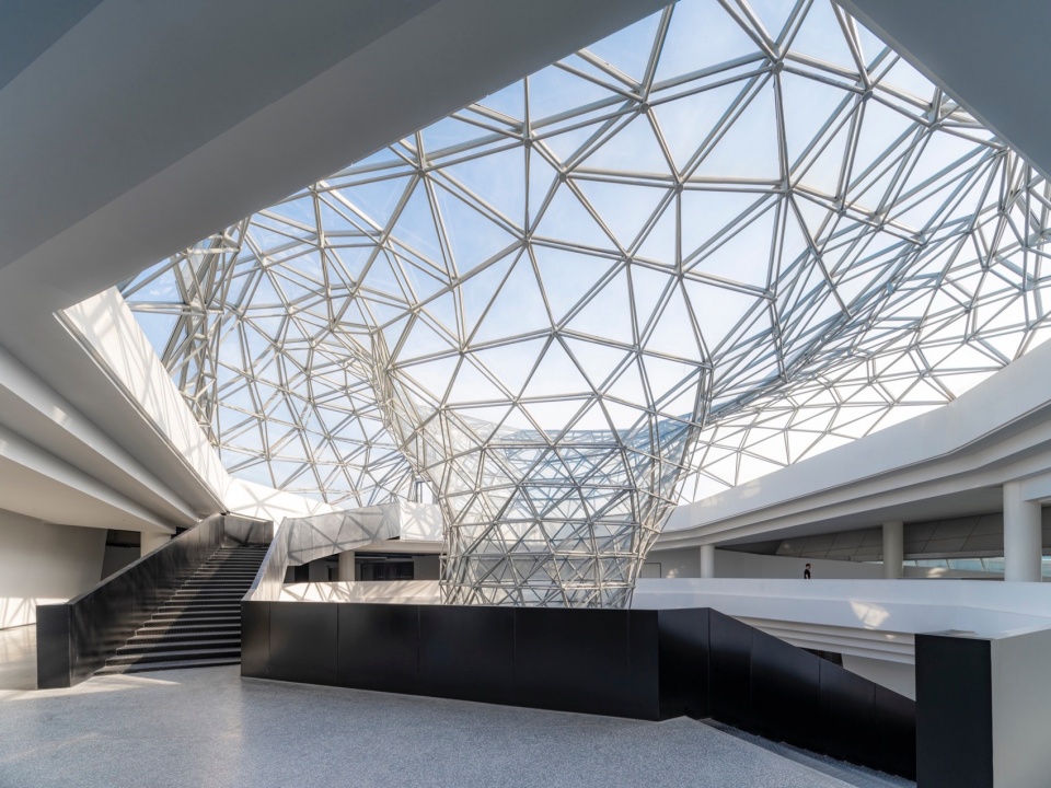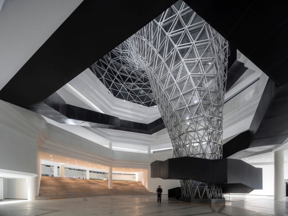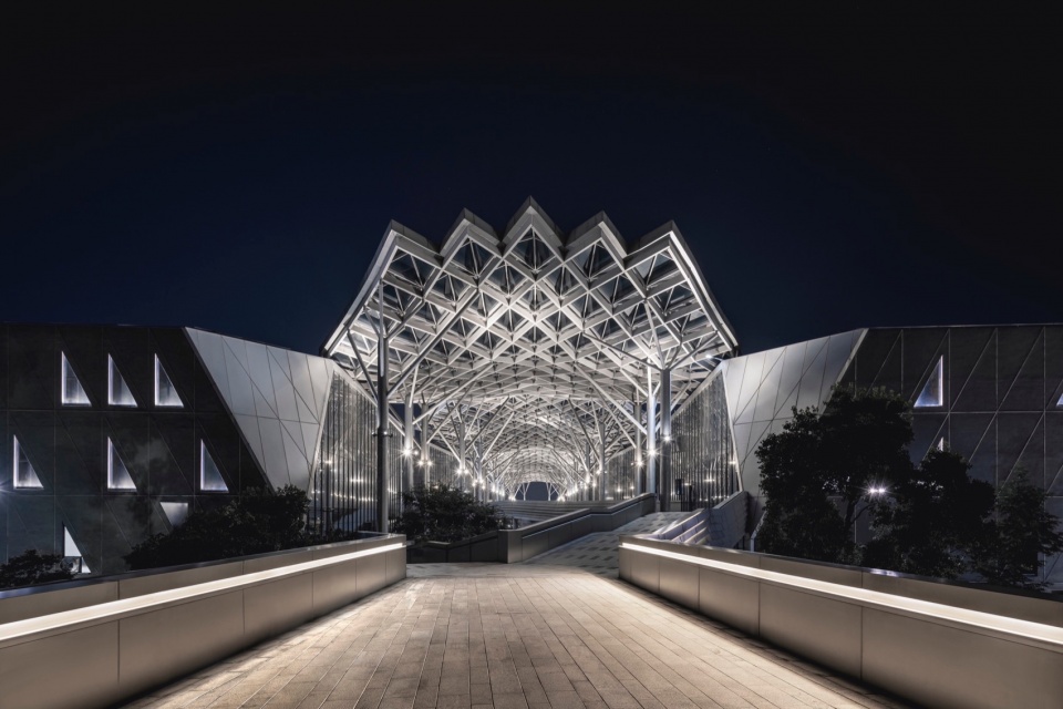 The facade design draws inspiration from the “axe-cut” texture in Chinese ink painting, combining with the southern waterfront characteristic to convey an Eastern landscape artistic conception. Balancing artistic interest and practicality, a folded louvered curtain wall was chosen: its folded texture echoes abstract landscapes, and the interplay of solid and void creates dynamic ambiguity, presenting a transparent, indeterminate image. Functionally, the undulating building surface provides efficient insulation and blocks light pollution while maintaining viewing sightlines from any angle. Indoors, light reflects between panels, creating diffused illumination and maintaining brightness.