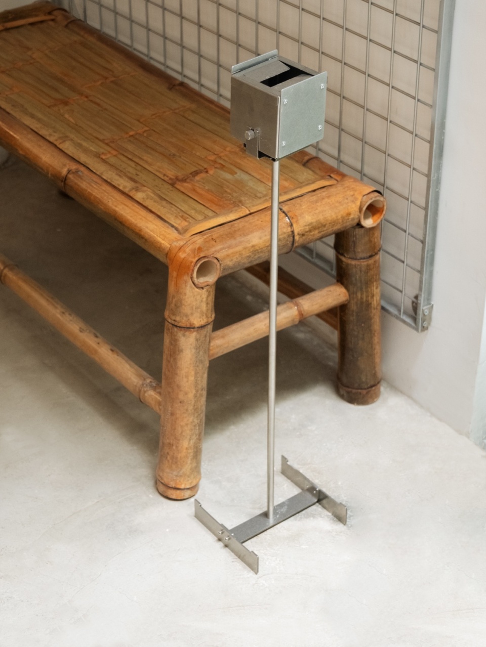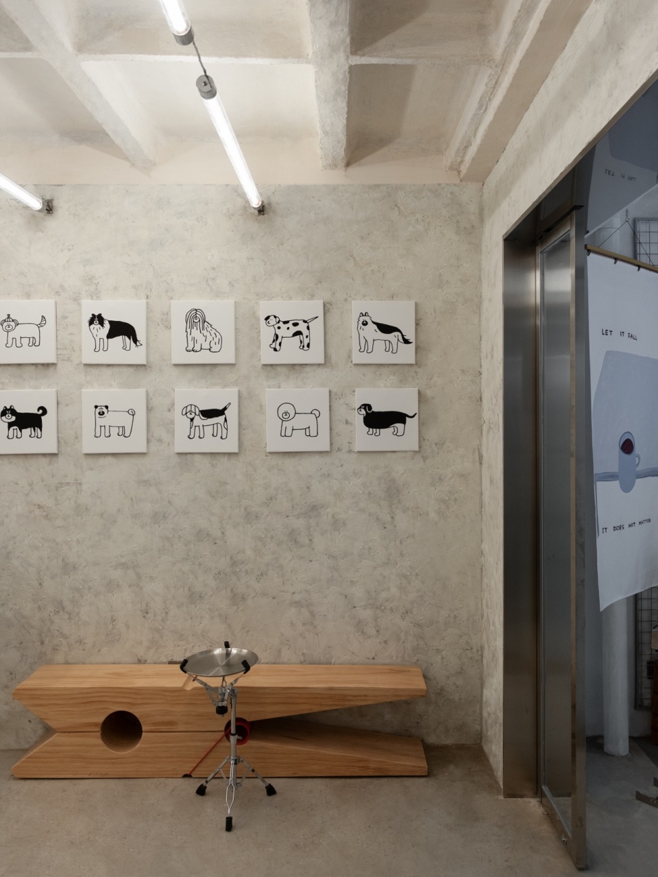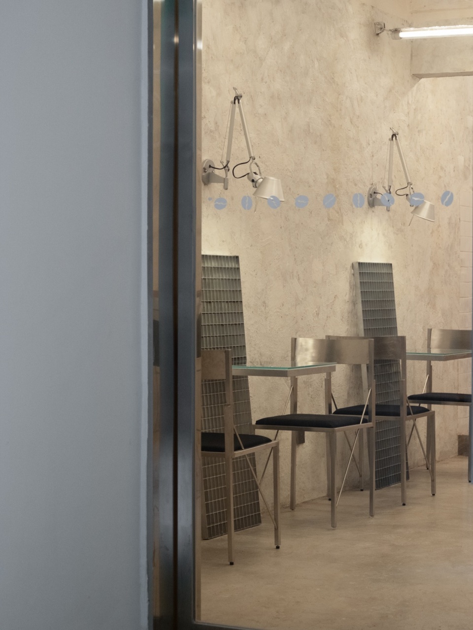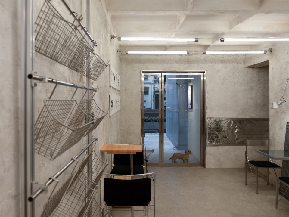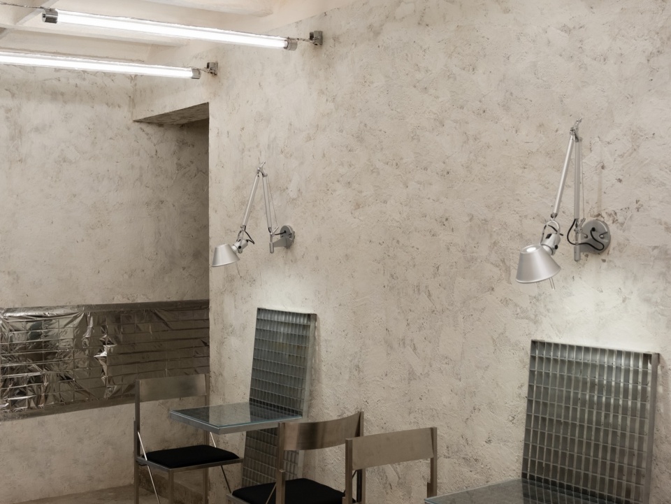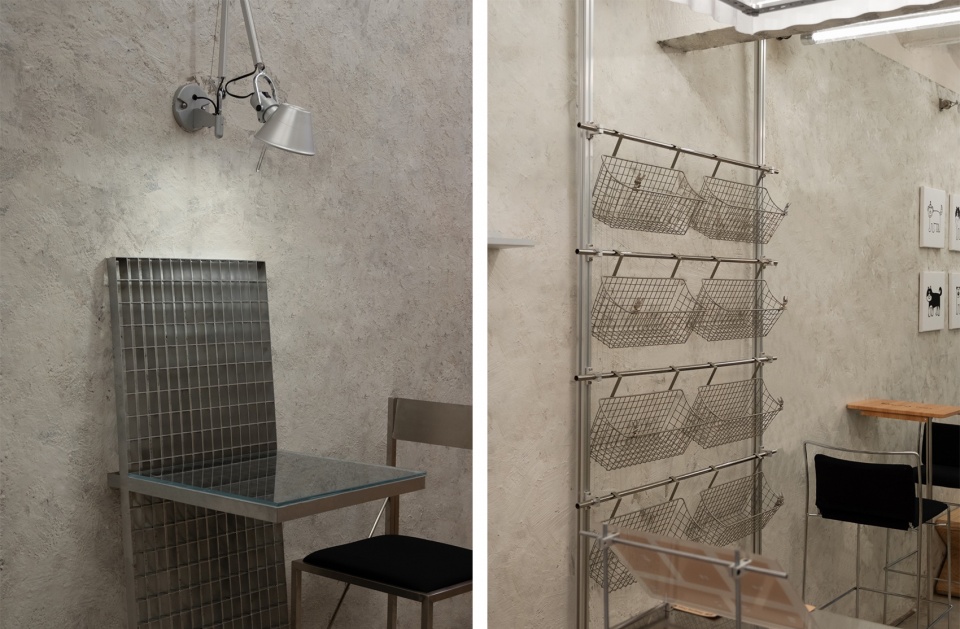 The interior retains much of the building’s original texture and traces of time. The cement floor has been carefully polished, while the old walls preserve their coarse, tactile finish. The original slab structure of the ceiling remains fully exposed, revealing the space’s raw character. The rough surfaces and the coolness of metal form a subtle contrast under shifting light, allowing the space to maintain a sense of warmth amid its industrial hardness.