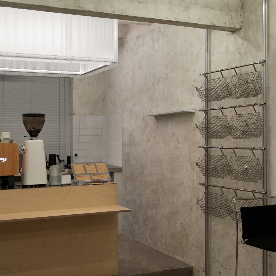 这间店兼具咖啡与烘焙的功能。我们将临街一侧规划为咖啡与就餐区,另一侧则作为烘焙后厨。咖啡区空间狭长,最深处几乎无法获得自然光。为此,我们在吧台区域设置了一个由角钢与阳光板构成的发光装置,柔和的灯带光线透过半透明的材质,为内部最昏暗的区域带来了温度与亮度。