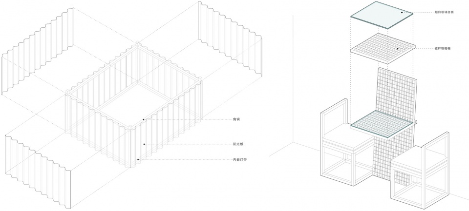 The furniture and shelving extend the site’s distinctive “steel” memory, forming the main thread of the spatial language. In the dining area, tables combine galvanized steel grating with glass tops, revealing the texture of the underlying metal framework and reinforcing the interior’s industrial character. The display shelves are constructed from aluminum profiles and chrome-plated steel rods, allowing flexible height adjustments that continue the rationality and adaptability inherent in industrial logic.