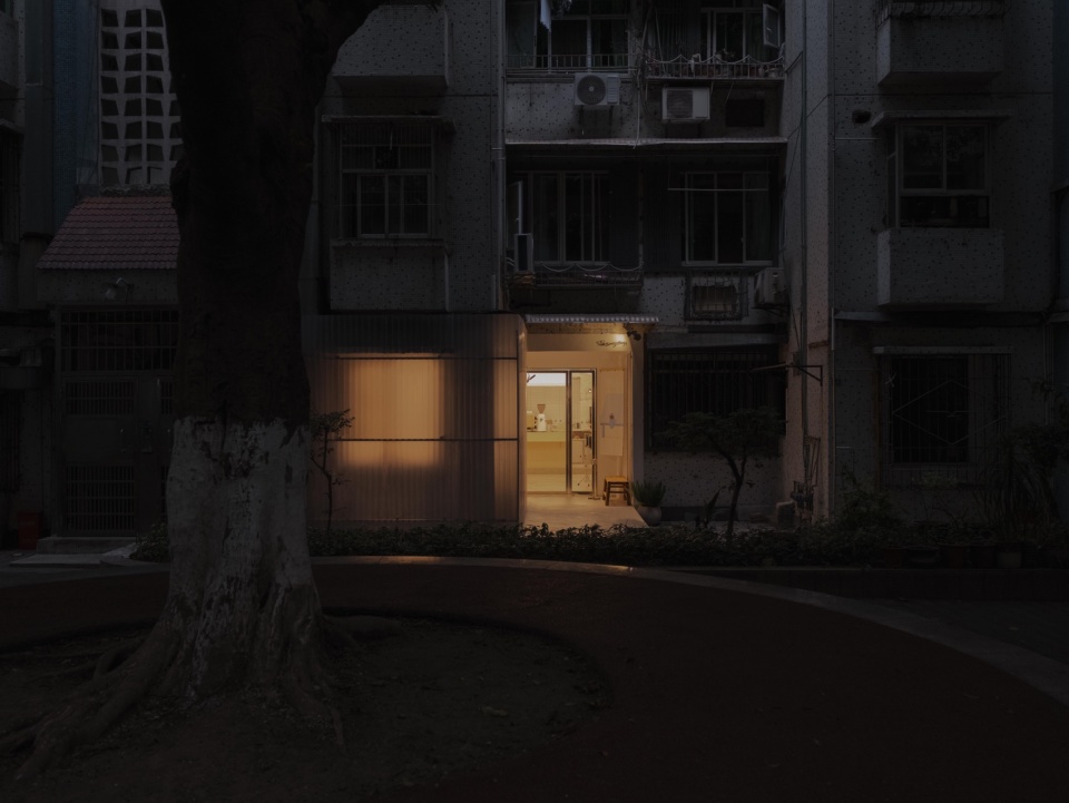 项目所在的建筑是一栋典型的老式民房,空间约70平方米。由于年代久远,外墙的水管与燃气管道裸露交错,墙体经过岁月侵蚀早已斑驳。面对这样的现状,我们希望以更轻巧的方式让其重新获得秩序与完整。外墙的改造从“隐藏”开始,我们以半透的阳光板包覆整个L形立面,将原本杂乱的外表整合为简洁、统一的体块,同时巧妙遮蔽裸露的设施,并预留检修门,保证后期维护的便利性。