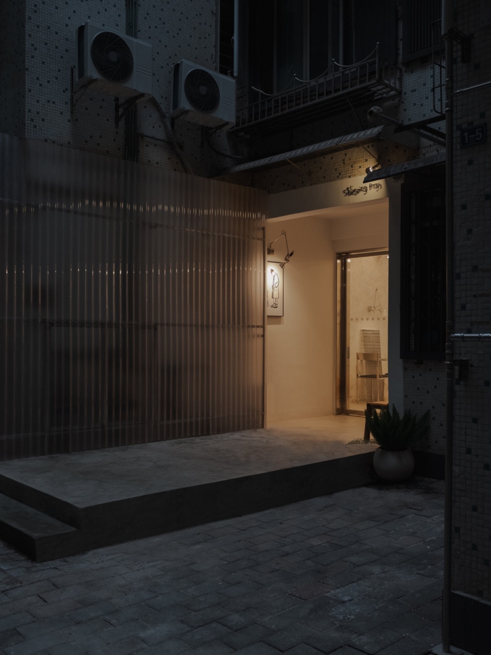 The project occupies a typical old residential building, with a total area of approximately 70 square meters. Over time, the exterior has weathered, with water and gas pipes exposed and crisscrossing across the façade. Confronted with this condition, we aimed to restore order and coherence through a minimal intervention. The façade renovation began with the principle of concealment: the entire L-shaped exterior was wrapped in semi-translucent polycarbonate panels, transforming the previously cluttered surface into a clean, unified volume. Behind this covering, the exposed pipes are discreetly hidden, while access panels are integrated to ensure convenient maintenance.
