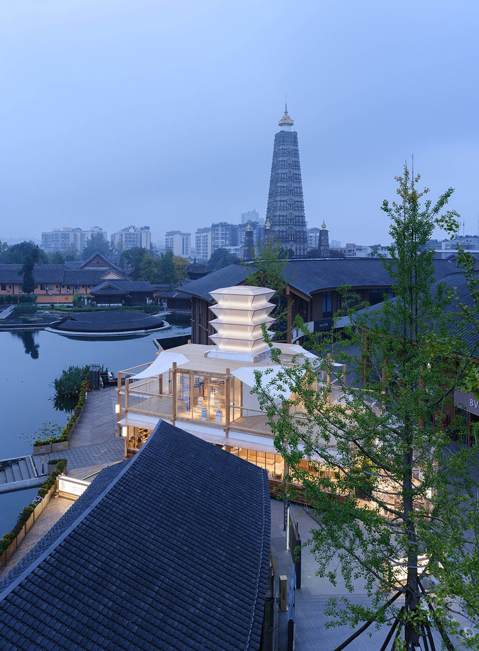 Notably, inspired by the millennia-old pagoda that once stood at Longxing Temple, we reinterpreted its form using a more transparent and lightweight material language. A double-layered crown-like installation was placed atop the Store Zero, echoing the existing pagoda of Longxing Temple and evoking a fresh dialogue with history. At night, this structure glows like a beacon, illuminating its surroundings.