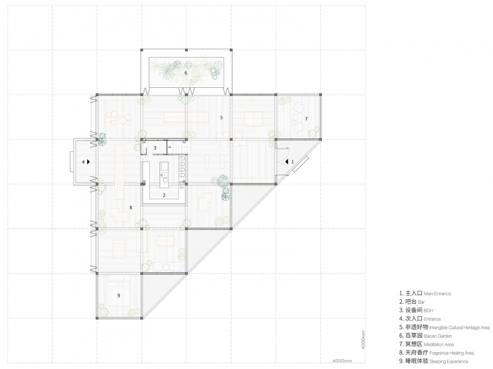 在首层的每一个模块化单元中,我们全景化展示了将中医药文化融入到日常生活方式的多种可能性:饮食、睡眠、气味、修身、养性;来自彭州本土各个地方的在地中医相关产品因此被同时分类和相互串联起来,形成了一种天府药市的全新场景化体验。同时在二层,我们还引入了对彭州中医药历史、中草药原材料的一系列文化展示,使得体验者具有更全面的科普性和互动性认知。