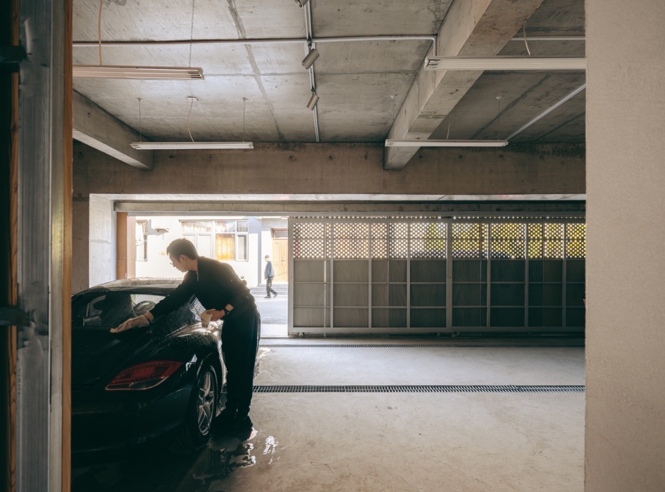 在日常工作之外,房主热衷于车辆机械,需要至少三个车位的车库,这一需求也几乎确定了临主路的一侧必须留给车库功能。于是,三车位车库以平移门的形式面向北侧村路展开,大门可整面打开,既可满足办公等对外空间的出入功能,又以开放的姿态打破乡村街面的封闭惯常。