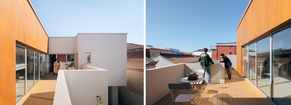 同时,街面空间也与内部庭院在两个方向上贯通连接,结合院墙的开放与封闭,为院落提供了内外属性转换的可能。庭院、露台与屋顶平台最大程度地将建筑与自然环境融合,每个房间均可直接通往室外,因使用功能不同造成的空间感受差异,在共同追求景观渗透性的过程中得以消减。