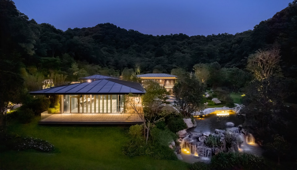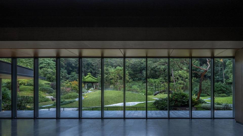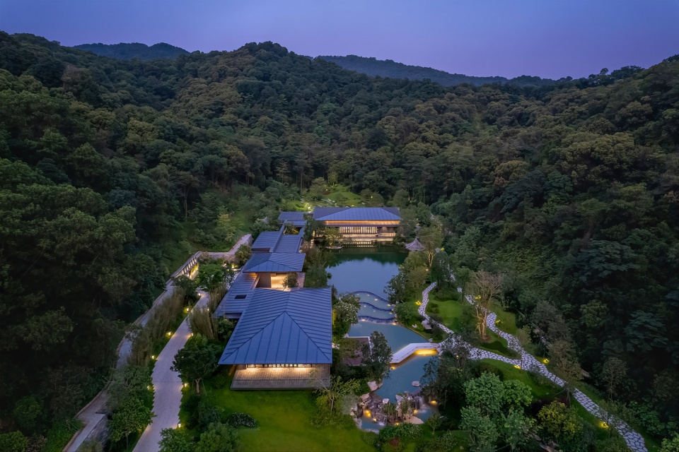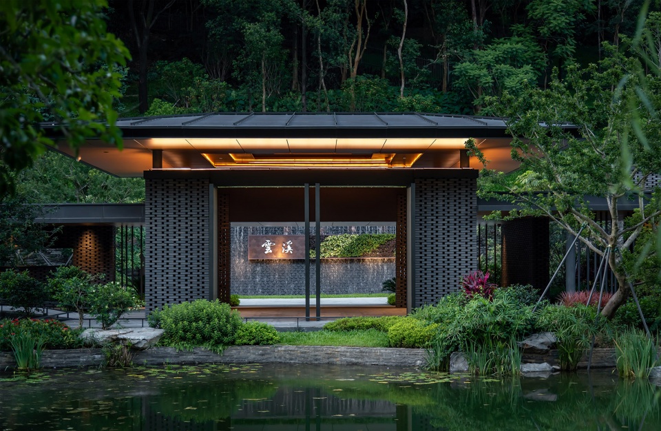 溪庭被设计为布局精巧、精致野趣、信步闲庭的园林庭院空间,结合借景对景的园林手法,形成“赏园、望溪、观山”三重游园感受,于山水之间展现岭南园林之美。其中入口门厅采用框景的构图手法,近处采用天然黑山石布置于水面,形成水中石景景观,中景以兰芷亭为构图核心,自然水面倒印山景,营造出人在画中游的趣味。主厅远观可俯瞰溪谷四季变幻的自然山林景色,地标性桥体虹桥与周边杉林叠泉的自然环境融合;近临镜面水庭,通过山林倒影提升庭园的纵深感。后庭以碧云叠泉为主题,以幽深山谷为背景,山涧曲折而下,松柏点缀其中,形成一幅自然的山水画卷。