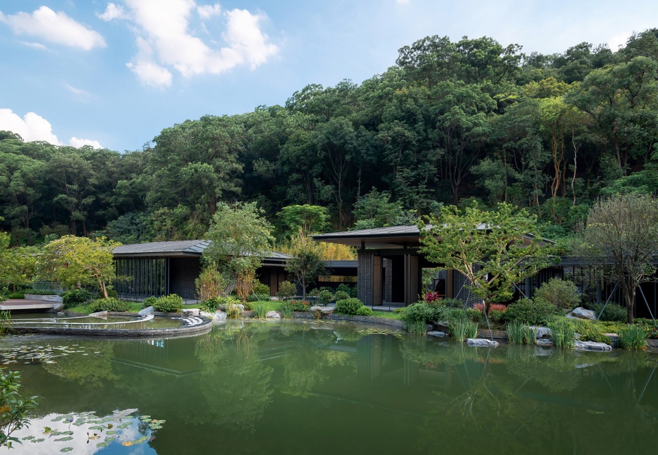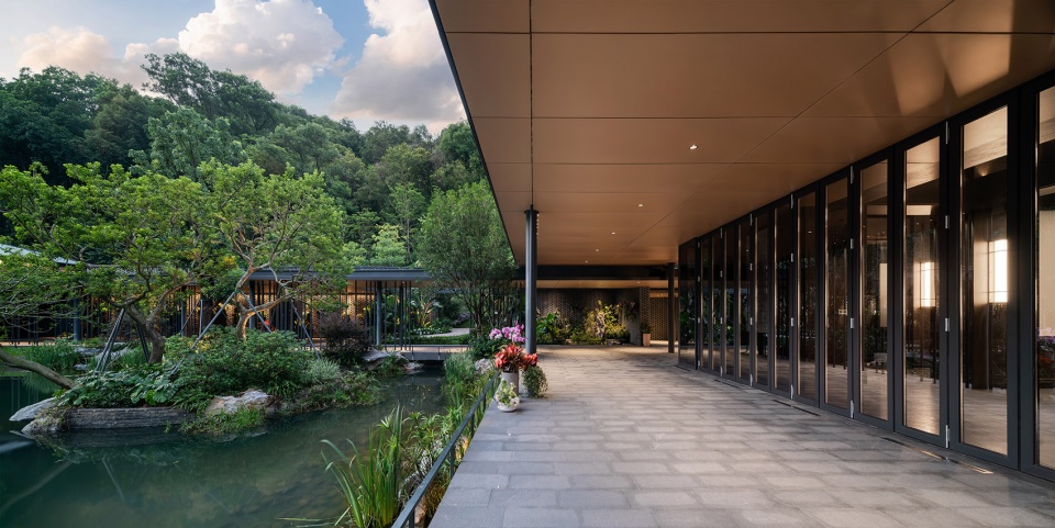The Creek Courtyard is designed as a garden courtyard space with exquisite layout, exquisite wildness, and leisurely strolling. Combined with the garden technique of borrowing scenery to create a triple garden experience of “viewing the garden, looking at the creek, and viewing the mountain”, showing the beauty of Lingnan gardens between mountains and waters. The entrance hall adopts the composition technique of framing the scenery. Natural black mountain stones are arranged on the water surface in the near distance to form a stone landscape in the water. The middle view is based on the Lanzhi Pavilion as the core of the composition. The natural water surface reflects the mountain scenery, creating the fun of people swimming in the painting. From a distance, the main hall overlooks the natural mountain scenery of the valley that changes with the seasons. The landmark bridge body Hongqiao is integrated with the natural environment of the surrounding fir forests and overlapping springs; the mirror-like water courtyard is close, and the depth of the garden is enhanced by the reflection of the mountains and forests. The back garden is themed with green clouds and overlapping springs, with deep valleys as the background, and the mountain streams are winding down, dotted with pines and cypresses, forming a natural landscape painting.