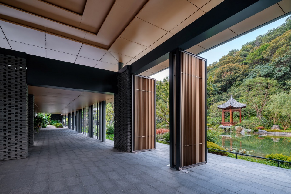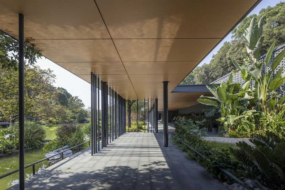 The walls are made of hollow gray ceramic bricks, which inherit the characteristics of Lingnan blue bricks and create a transparent, exquisite and modern texture; the sparse and dense metal columns on the outside of the corridor form rhythmic light and shadow under the projection of light, creating a spatial atmosphere of walking in the forest.