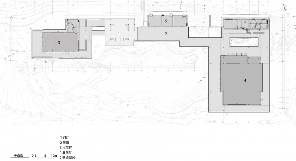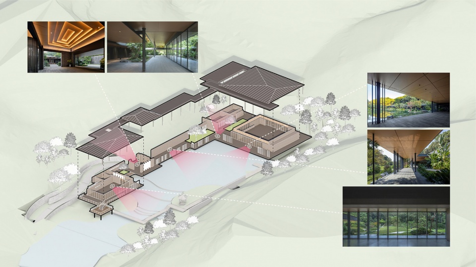 建筑以入口门厅为中心,主厅与次厅分布与东西两侧,整体环绕溪涧水面呈L布局。门厅往东可到达主厅,内部是开阔的无柱多功能空间,可适应将岭南植物历史的展示需求,也可作为外事活动接待场所使用。门厅往西可到达次厅,适用于展出小尺度的植物标本,厅内可远眺溪谷径或在平台回望主厅。三个主要空间通过折廊相连,游客在行进当中可观赏到两侧景展墙或者园林景观,感受到一步一景游园体验。