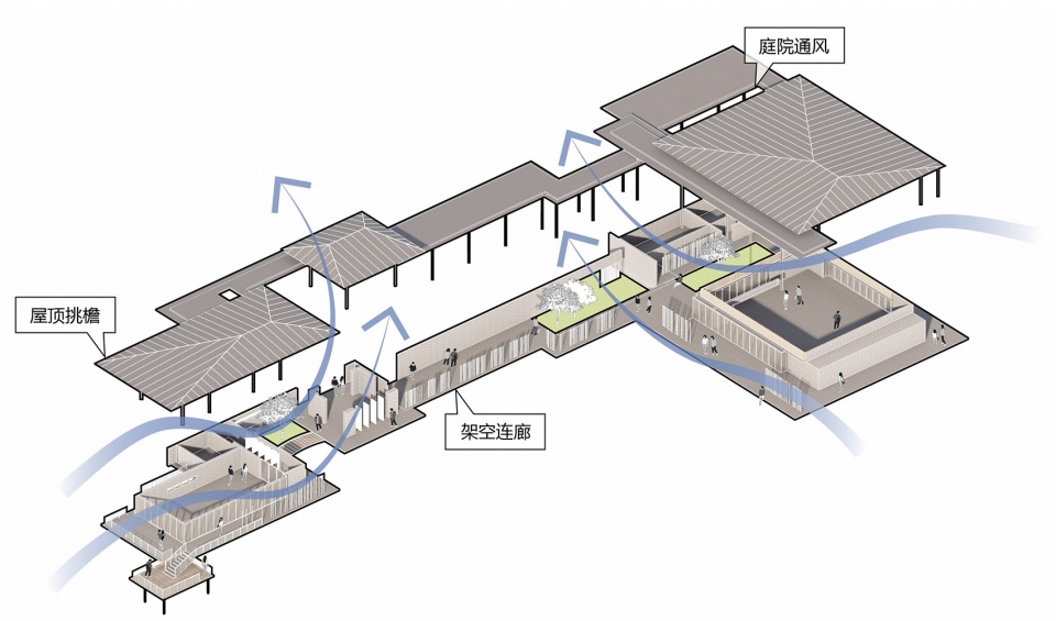 为适应岭南炎热多雨的气候,建筑通过挑檐与连廊实现遮阳与避雨,在廊道链接的位置设有多处小尺度的庭院,在丰富景观空间层次的同时,通过促进局部拔风调节建筑的微气候。