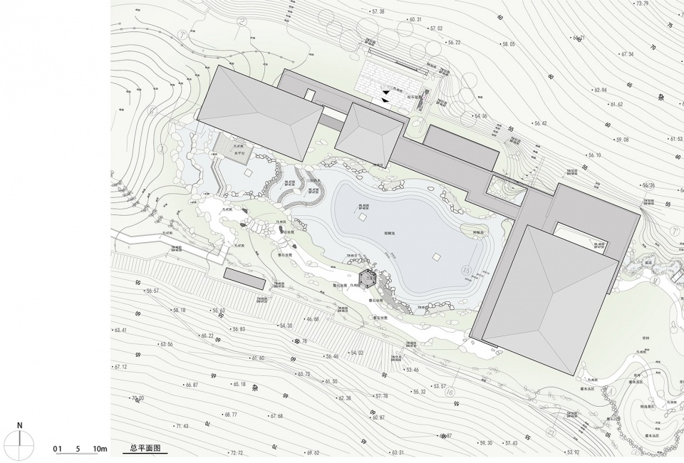 自然教育馆背靠白云山葱郁幽深的峡谷,用地中心为山涧汇聚而成的水面,建筑体量化整为零,采用轻盈低矮的姿态,环绕水面平缓地展开。各主体建筑间以连廊联系,结合敞廊、庭院、平台等开敞空间,整体布局自然流畅不拘一格,营造出“融于山水、内外渗透、步移景异、亭榭轩桥”的现代岭南园林建筑意境。