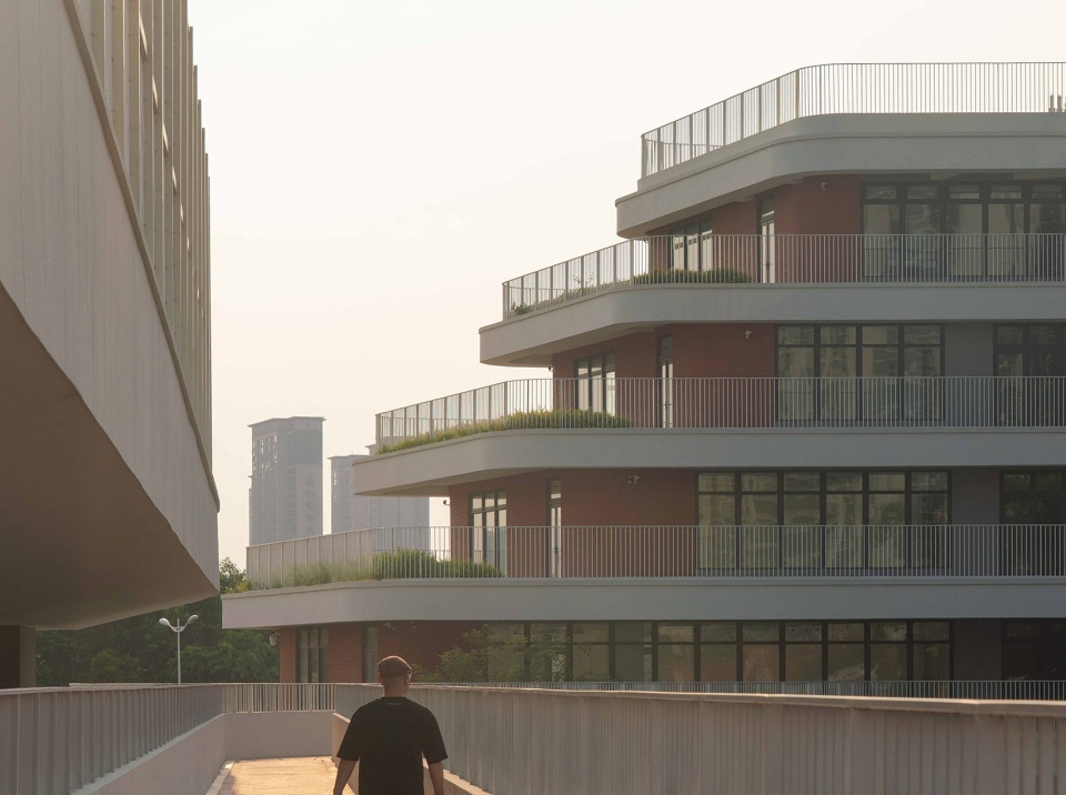 教学楼的大弧线,来源于进入校门之后并把建筑的形体往民俗文化园方向衔接引导的大思路,逐级内推的大露台朝西敞开,四季流转间,每一时刻的落日风光都能被完整收纳。这些露台空间,终为在校师生筑起了高品质的自由活动场域。