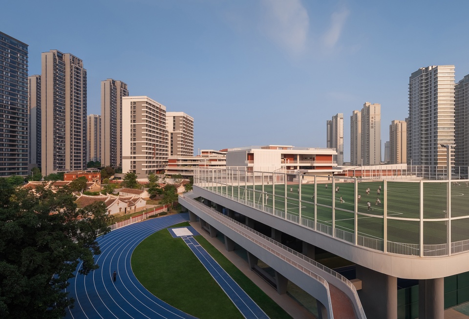 科技中学五缘校区的设计,没有让场地的“故事”消散:原场地的老建筑虽已迁址至紧邻的坂美民俗文化园,但设计通过空间的退让与视线的贯通,将民俗园的景致“请”入校园。
