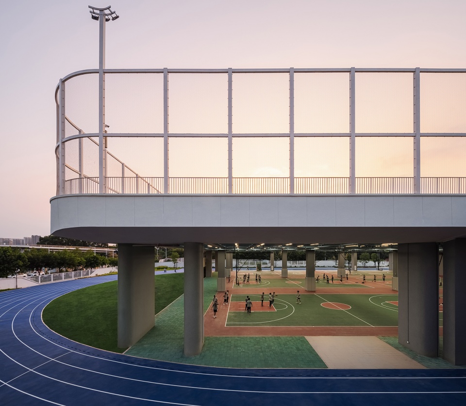 架空的运动场如一块悬浮的巨型露台,腾跃于校园之上——向外,它承接湿地公园的一线绿意,可远眺环岛干道的街景;向内,能俯瞰跑道上奔跑的同学身影。自然、城市与校园,一边是自然,一边是城市,一边是校园,几个不同要素之间的距离被拉进。