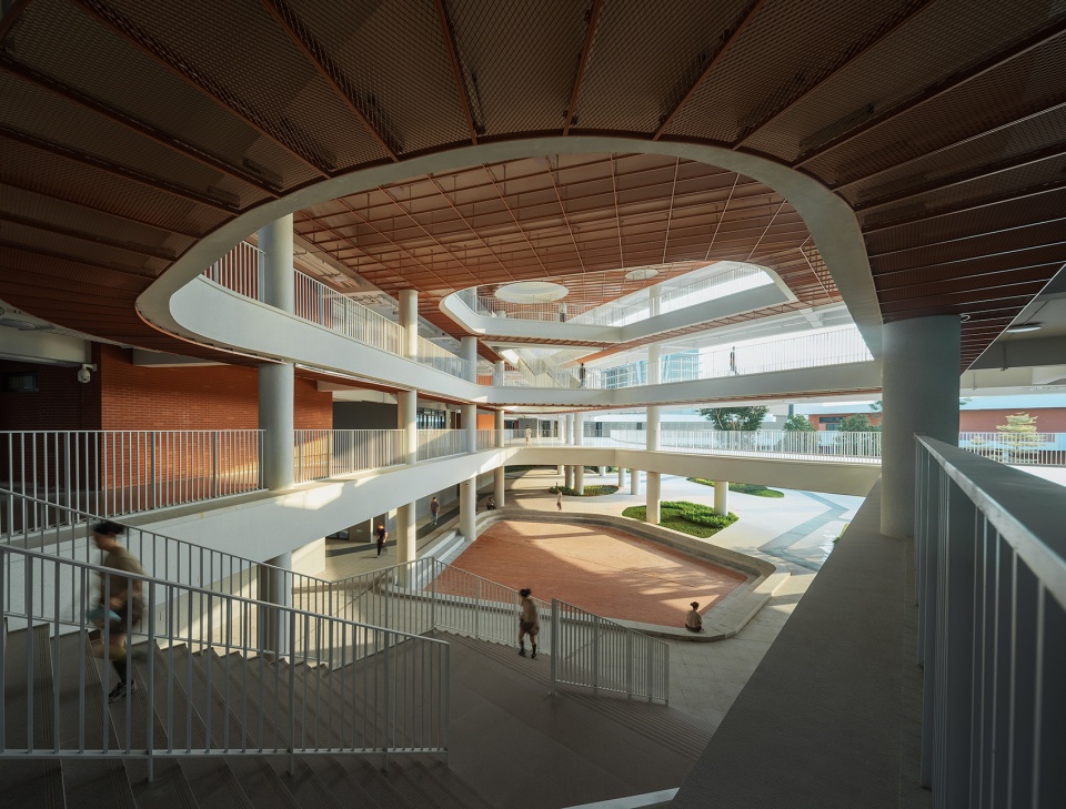 Xiamen locals have always loved listening to the wind and gazing at the sea. The design of this school follows this regional sentiment: leveraging the natural slope of the site (higher in the northeast and lower in the southwest) and adapting to the needs of spaces of different scales, it creates layered stepped terraces. Each terrace “captures” its own unique scenery and accommodates diverse activities: To the west, the stepped terraces of the teaching complex extend to the auditorium and sports hall. Leaning on the railings, students can take in the full view of Wuyuan Bay Wetland Park and the afterglow of the setting sun. To the east, the platforms and balconies of the dormitory buildings face Xiamen-Jinmen Bay. At dusk, the setting sun and sunset glow dye the red-brick corridors, platforms, and connecting bridges in a warm orange hue.